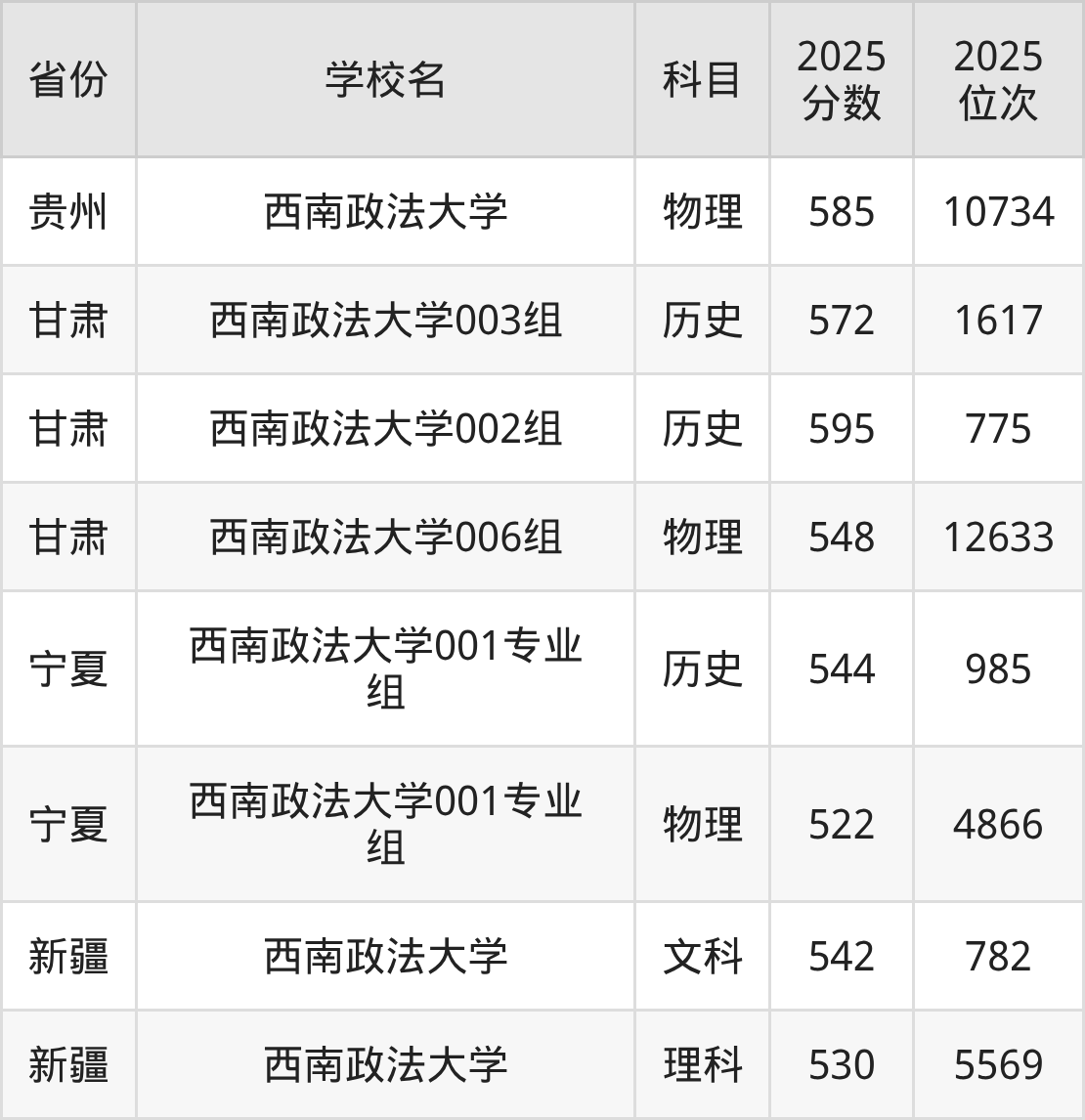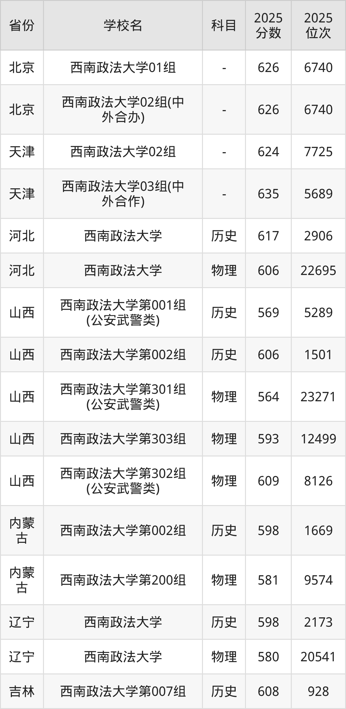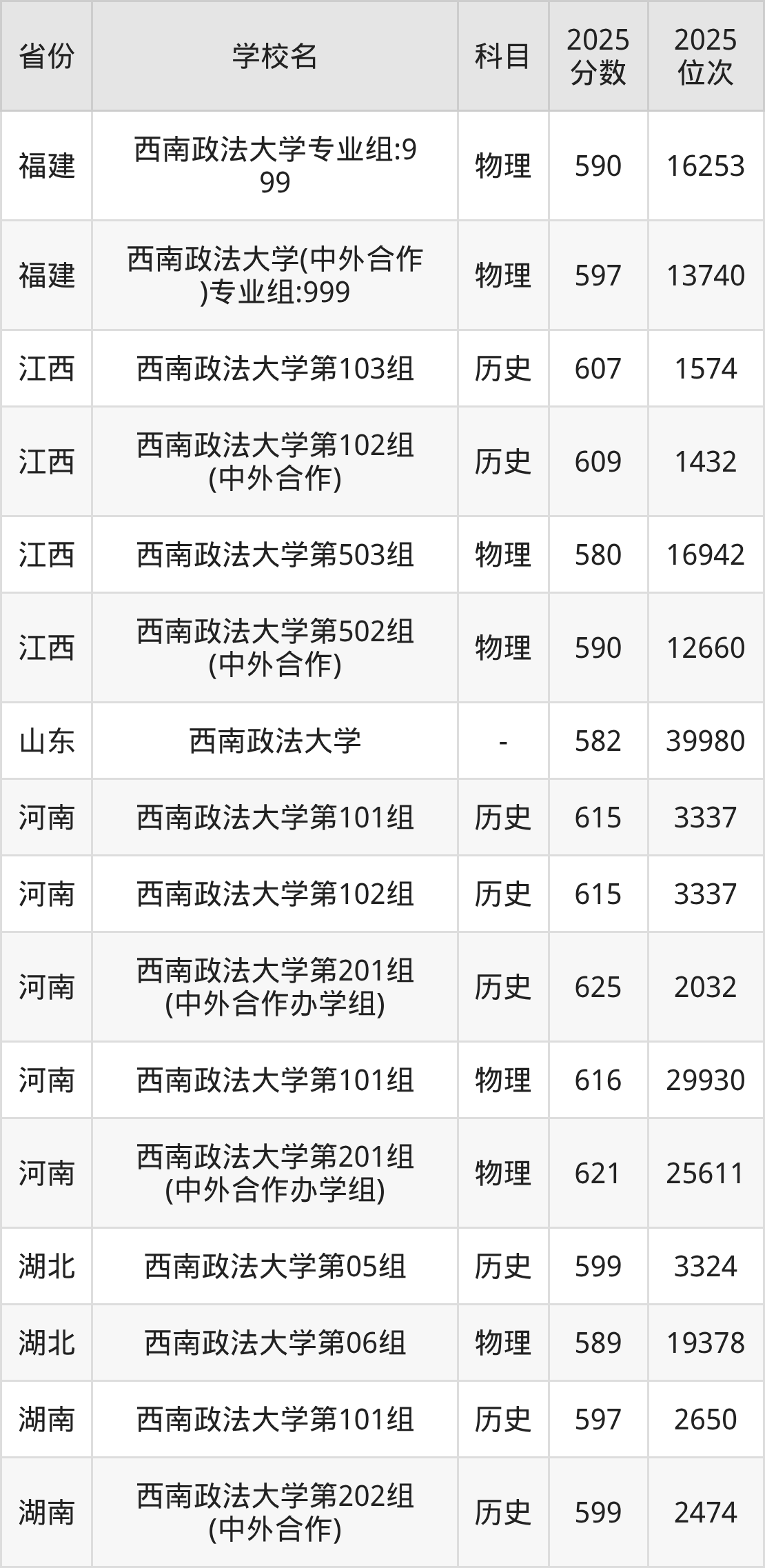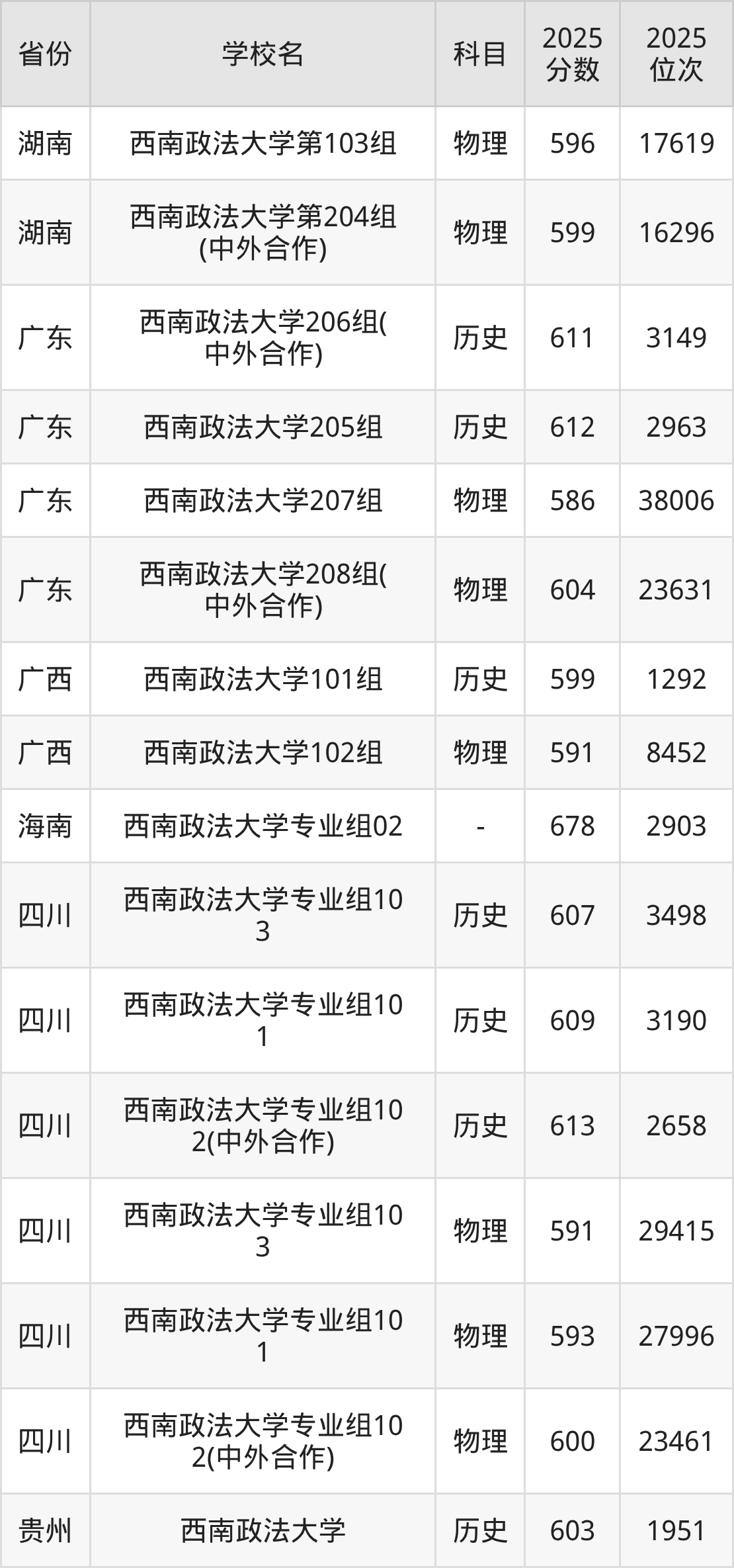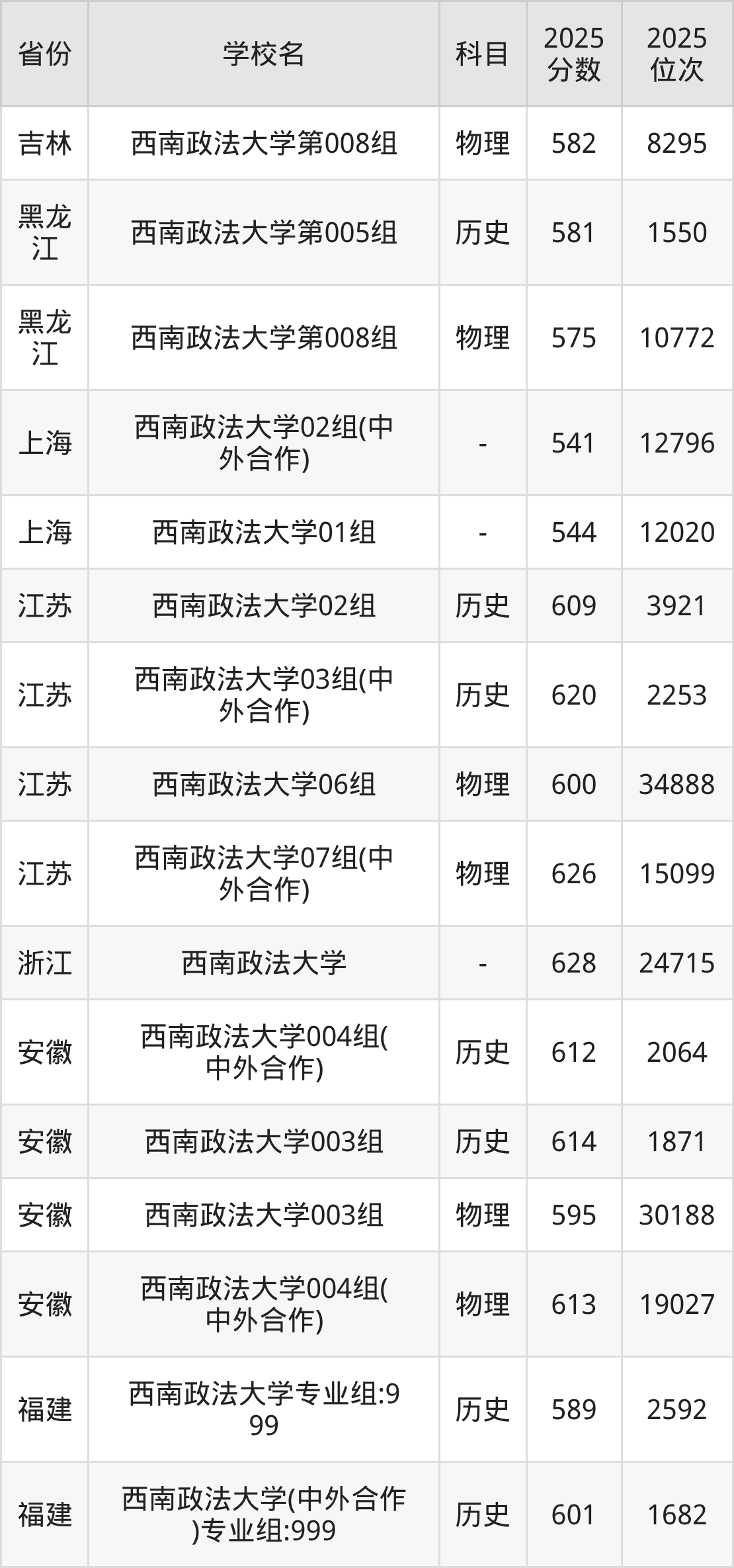 2025年西南政法大学历史类最低分556分(6163名)、物理类最低分540分(37736名)。