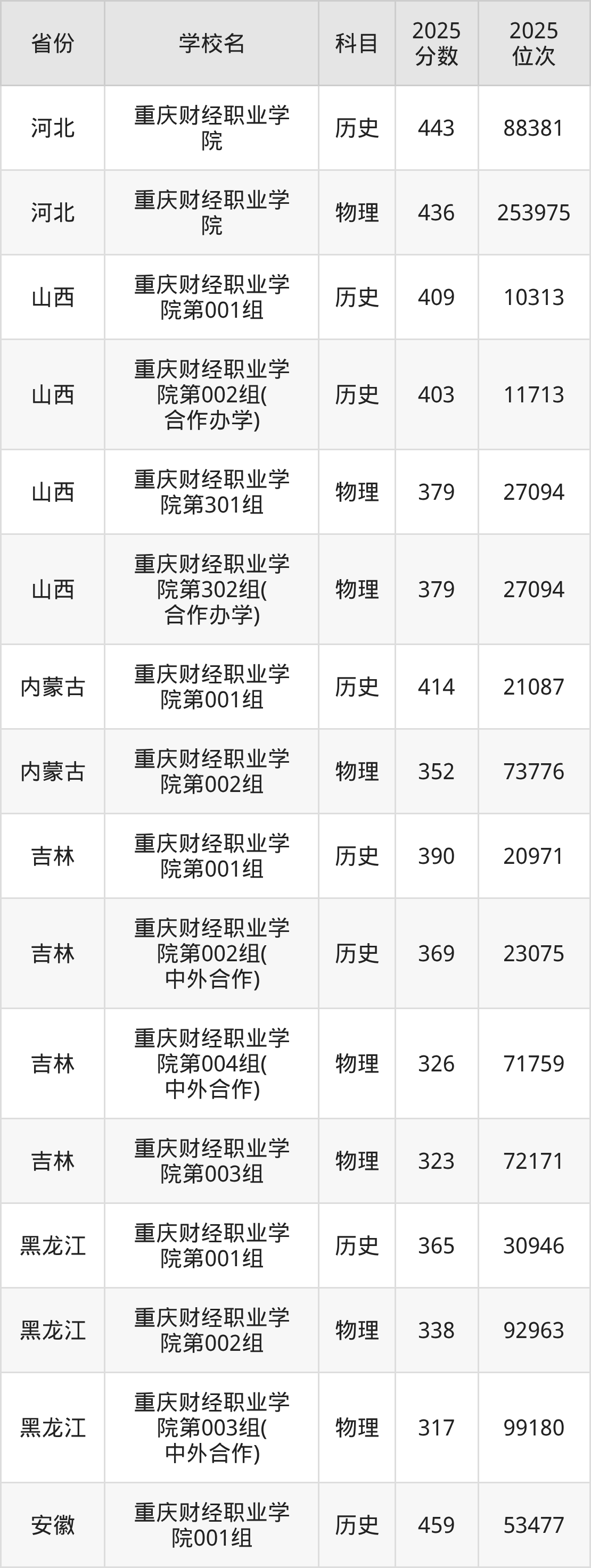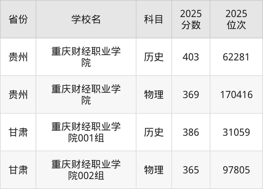2025年重庆财经职业学院在市内分历史物理科目类录取,其中历史类最低分是382分、对应位次是51784名;物理类最低分是362分,对应位次是124405名。