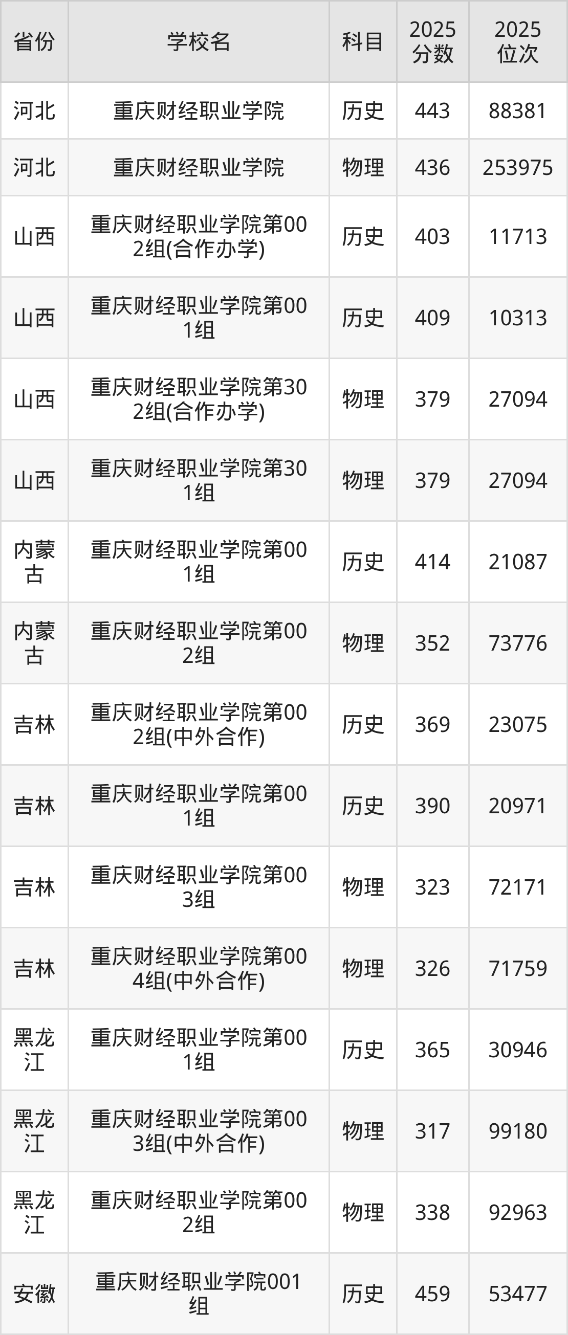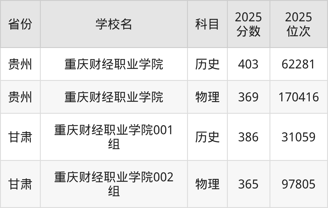 2025年重庆财经职业学院历史类最低分382分(51784名)、物理类最低分362分(124405名)。