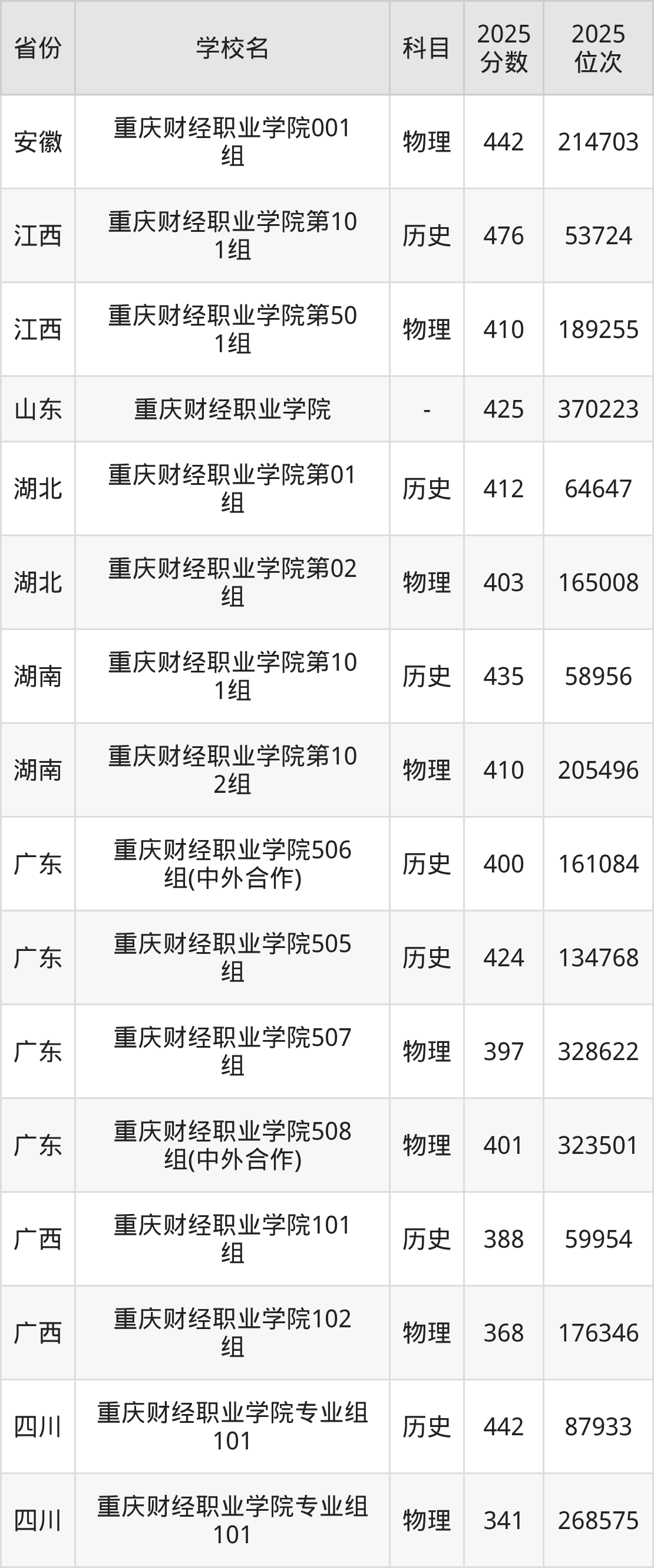 下面是重庆财经职业学院2025年录取分数线各省汇总,一起来了解下吧。