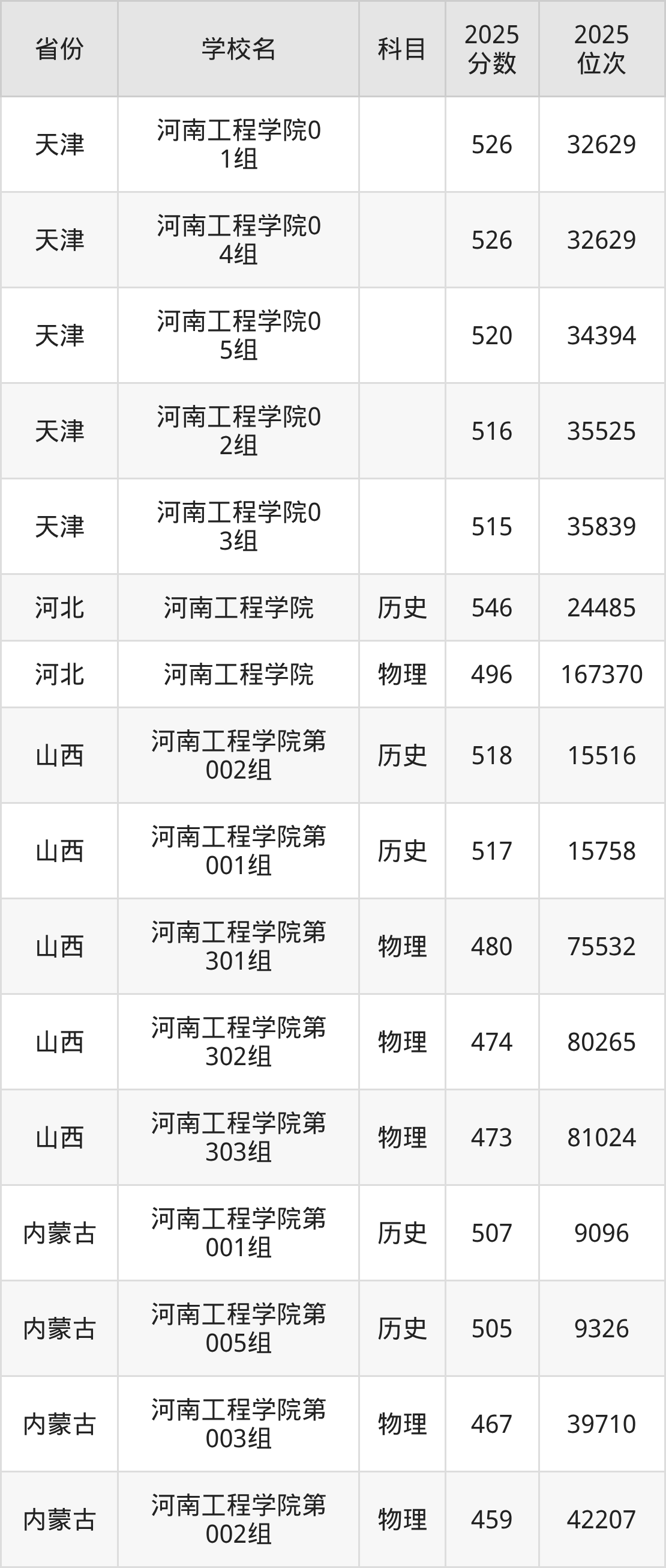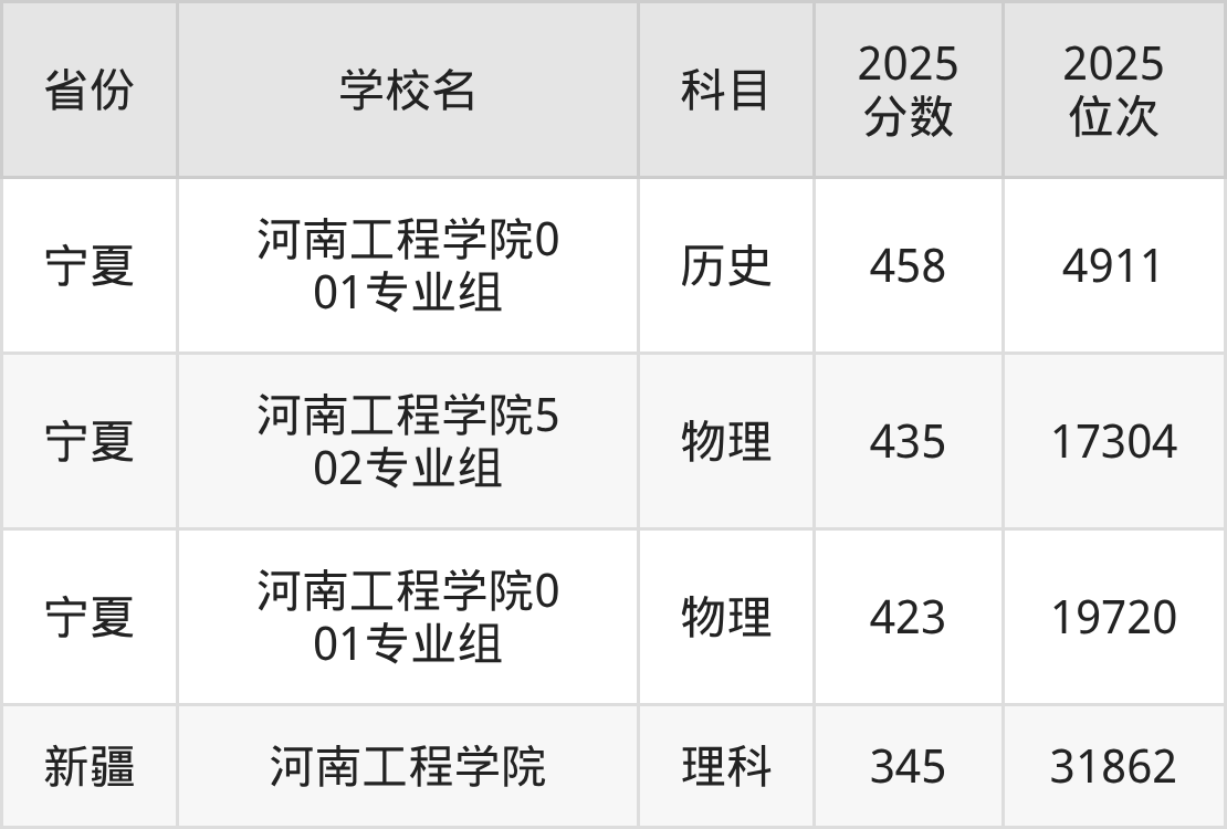 2026年河南工程学院录取分数线预计在480分及以上,在各省录取最低分存在一定差异,如:2025年河南工程学院在山西录取最低历史类517分、物理类473分,在内蒙古录取最低历史类505分、物理类448分,在吉林录取最低历史类491分、物理类413分。