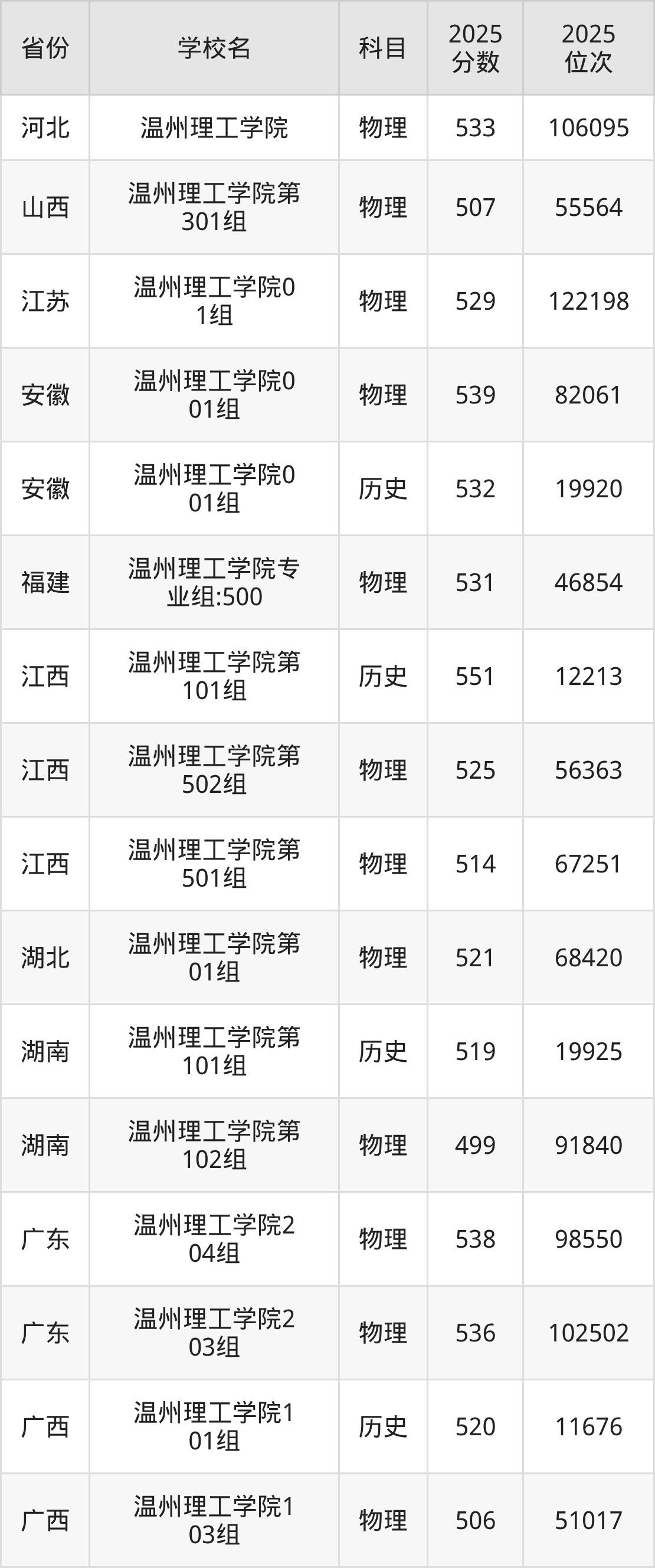 2026年温州理工学院录取分数线预计在510分及以上,在各省录取最低分存在一定差异,如:2025年温州理工学院在山西录取最低物理类507分,在广东录取最低物理类536分,在福建录取最低物理类531分。