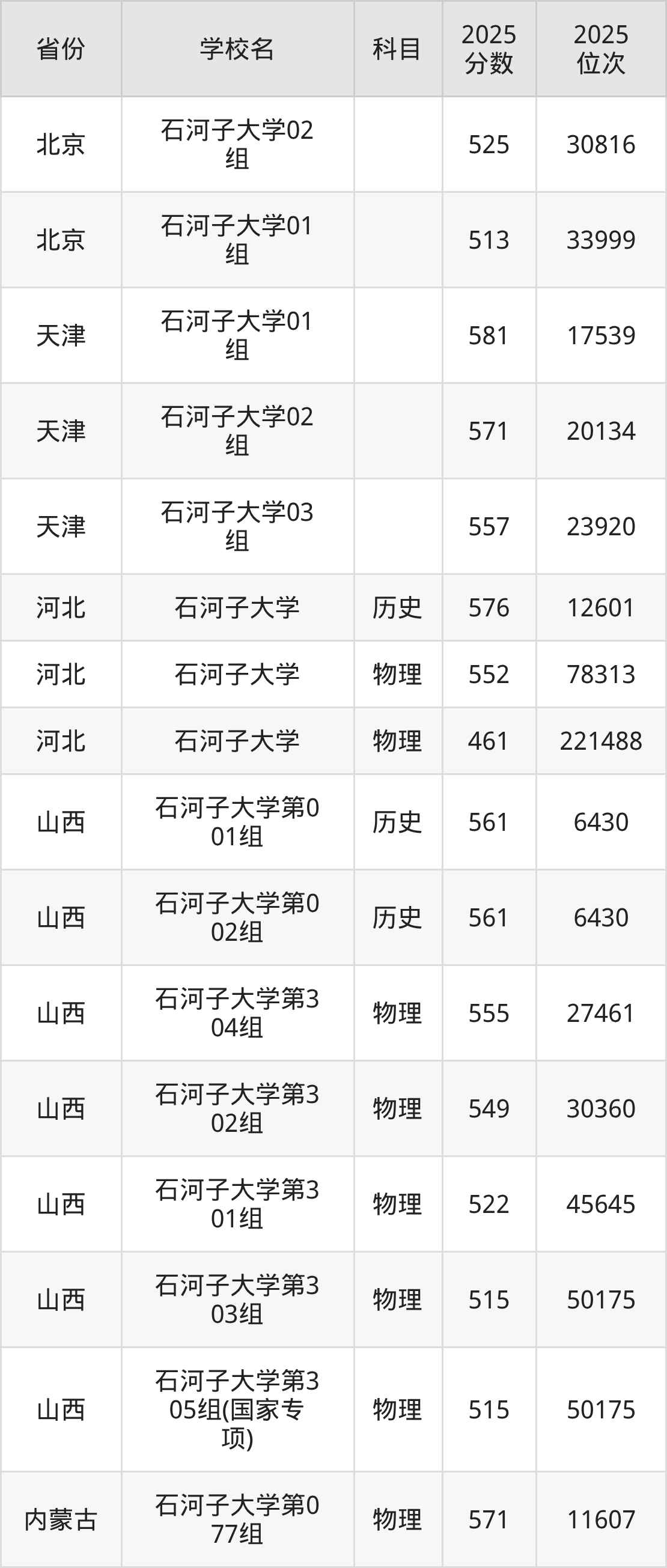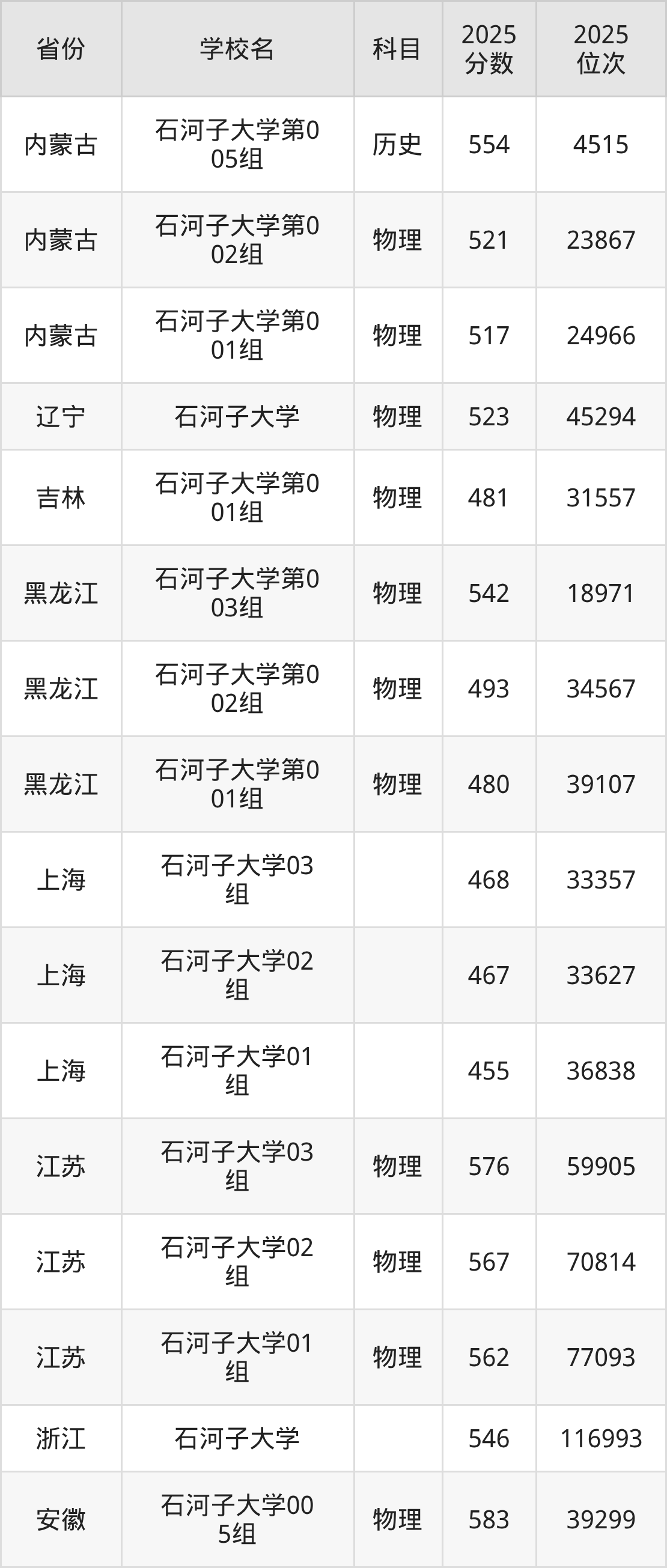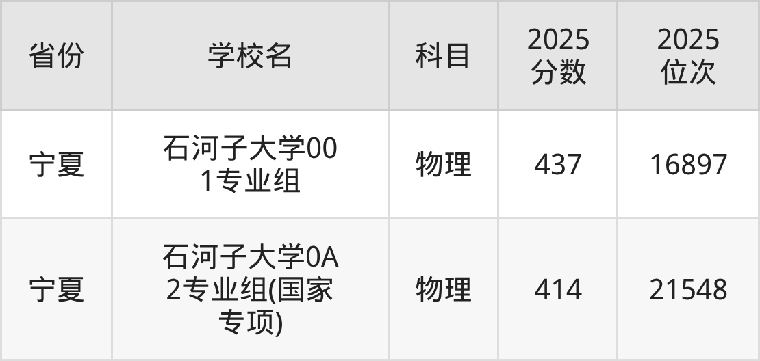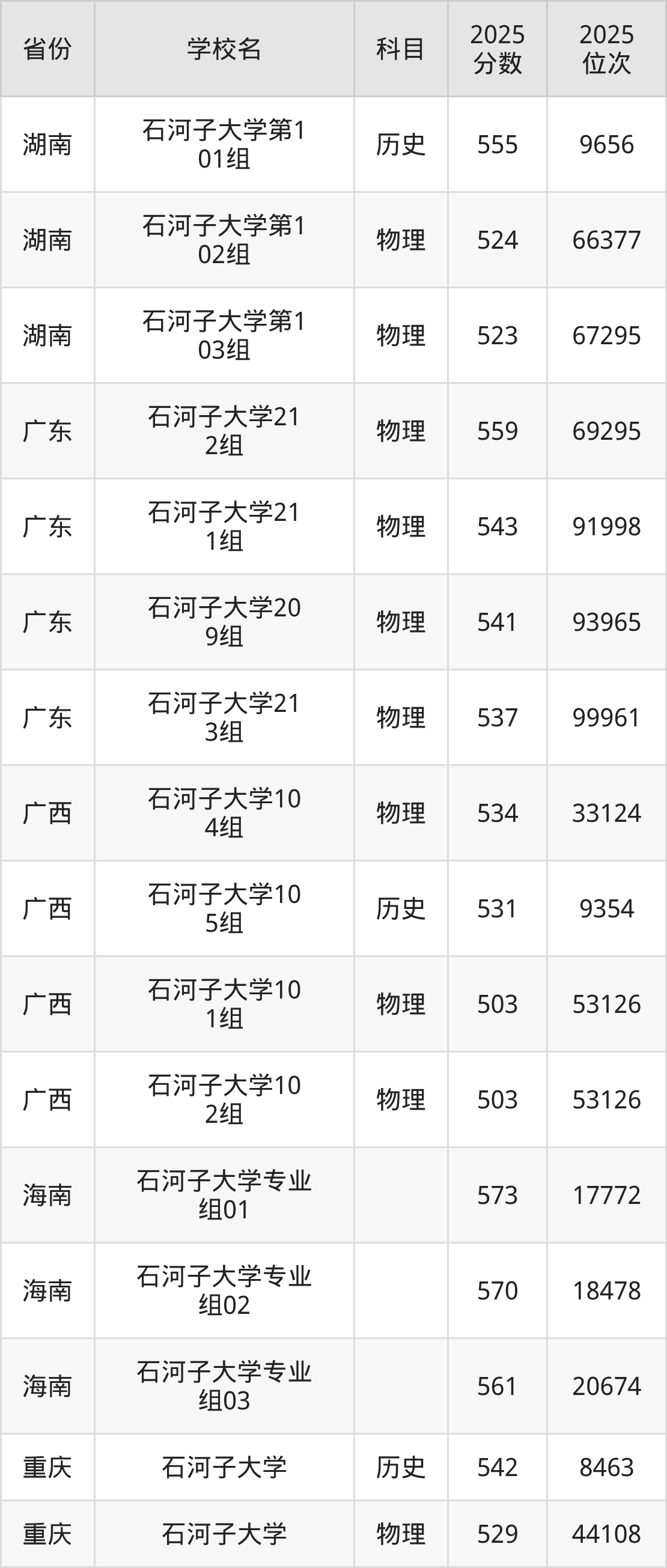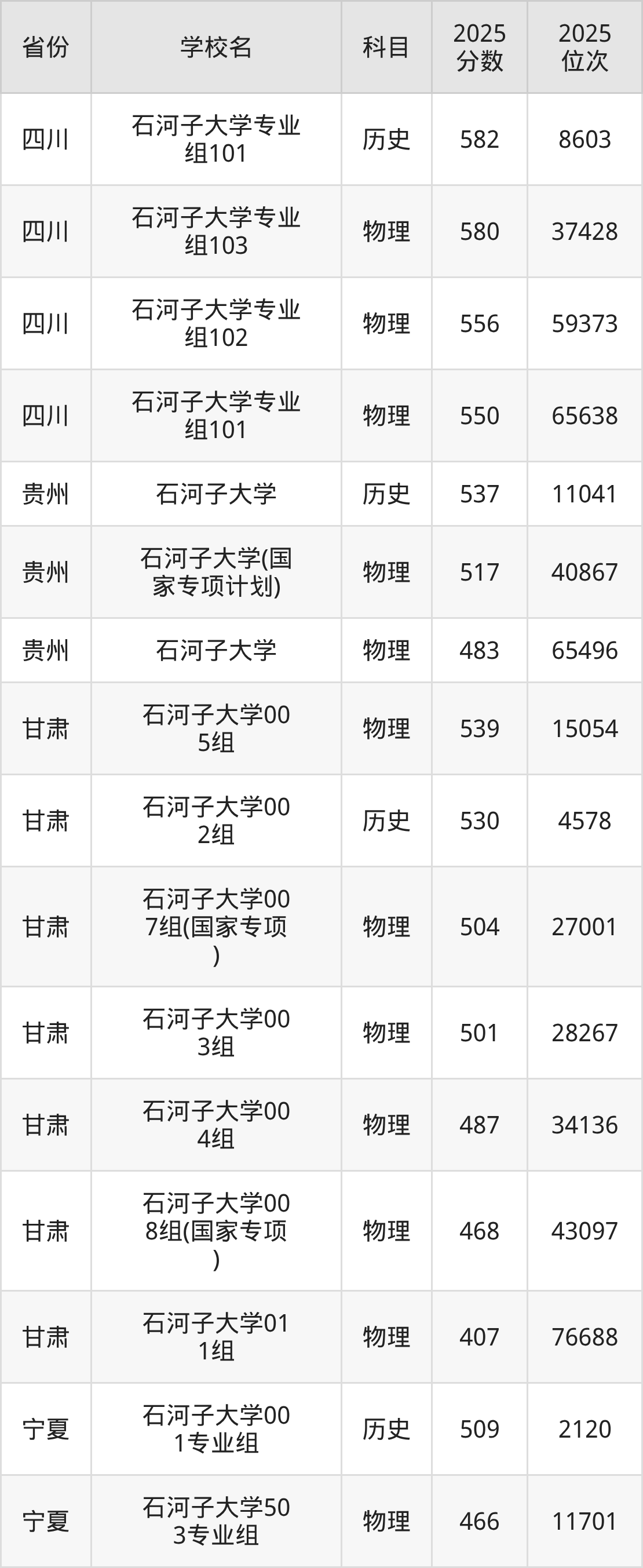 2025年石河子大学文科最低分476分(2893名)、理科最低分296分(41296名)。