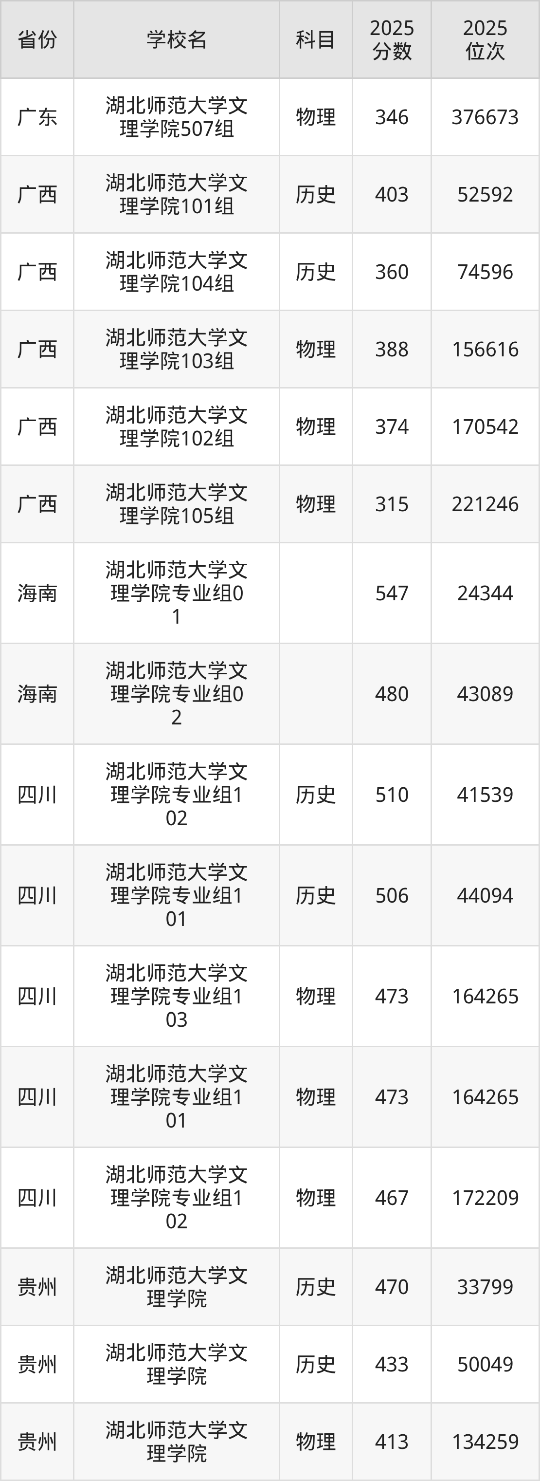 2025年湖北师范大学文理学院历史类最低分152分(138116名)、物理类最低分150分(247751名)。