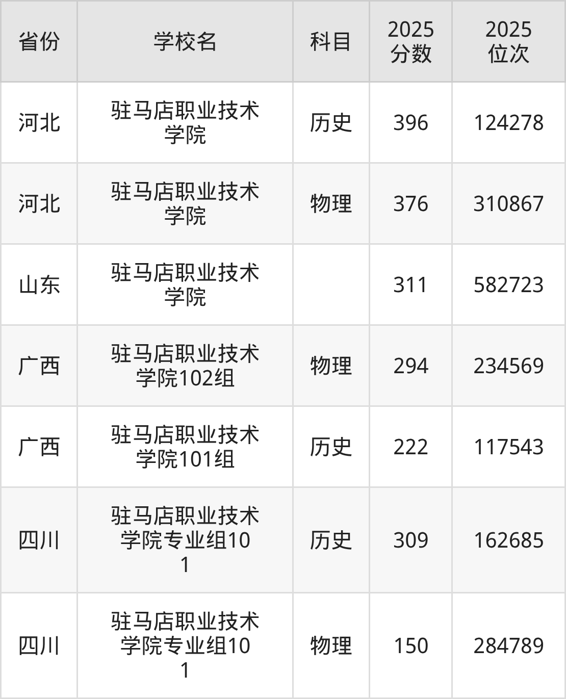 2025年驻马店职业技术学院历史类最低分396分(124278名)、物理类最低分376分(310867名)。