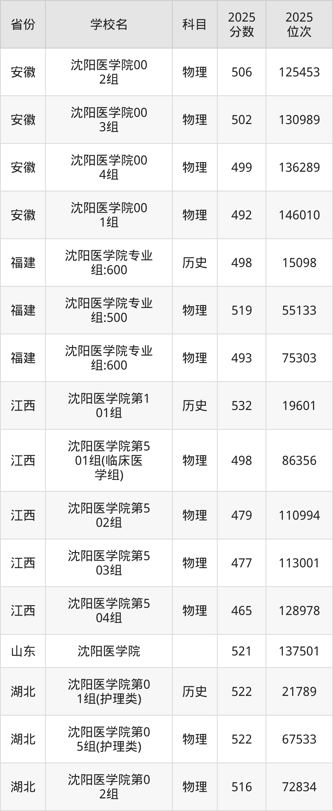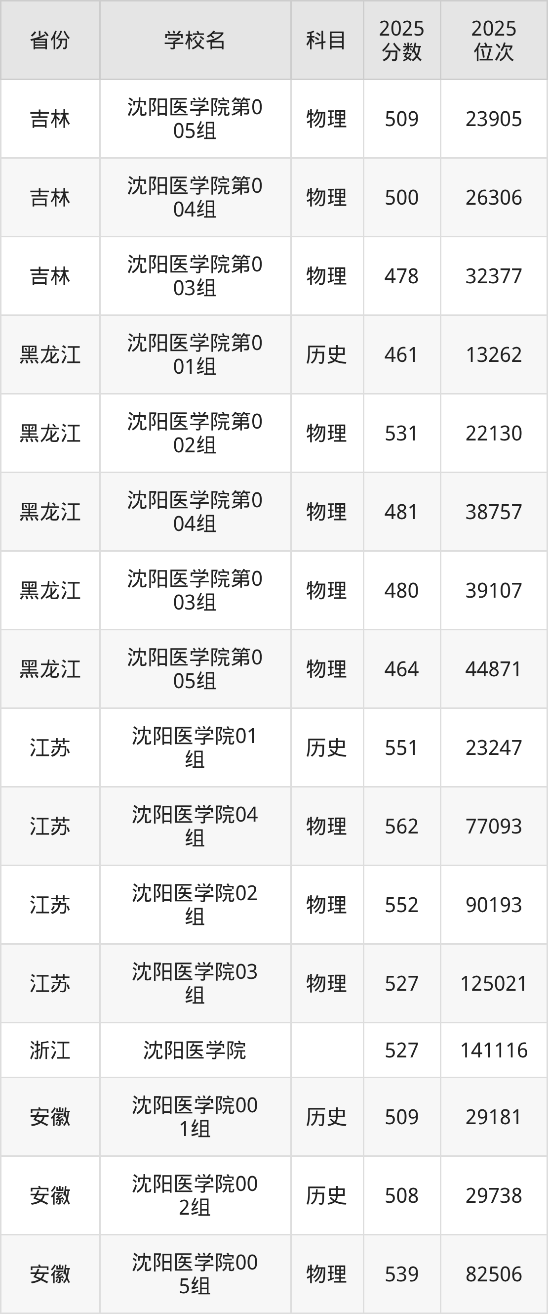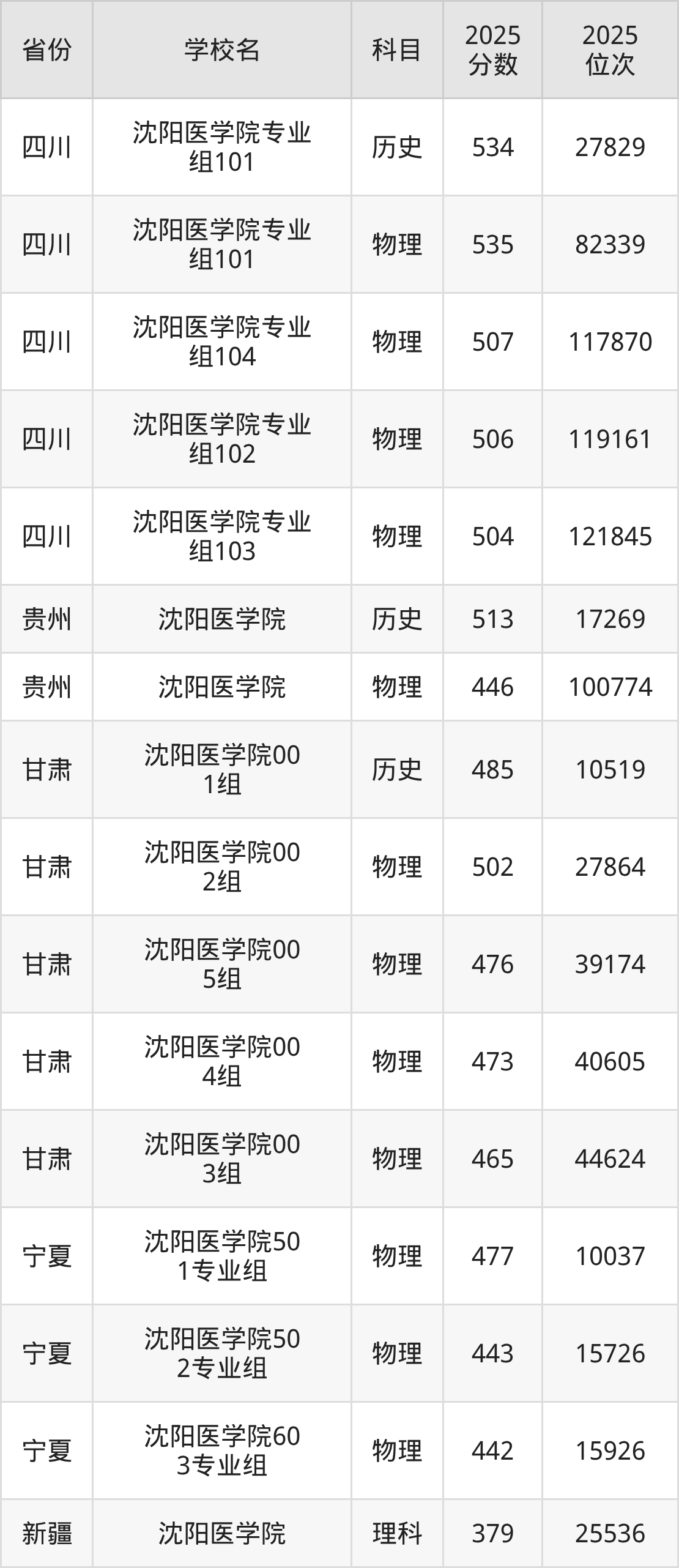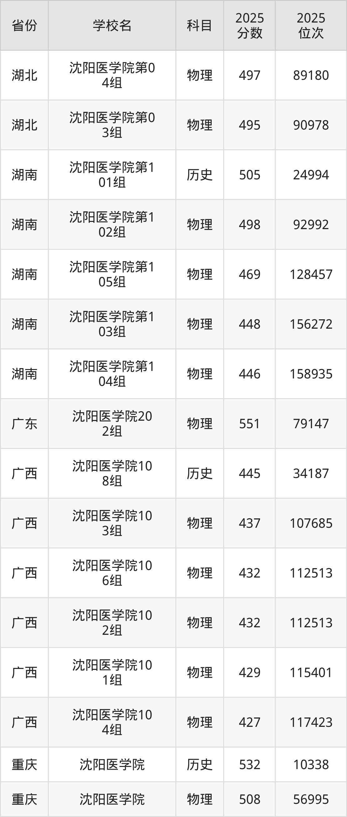 2025年沈阳医学院历史类最低分479分(18714名)、物理类最低分433分(90062名)。