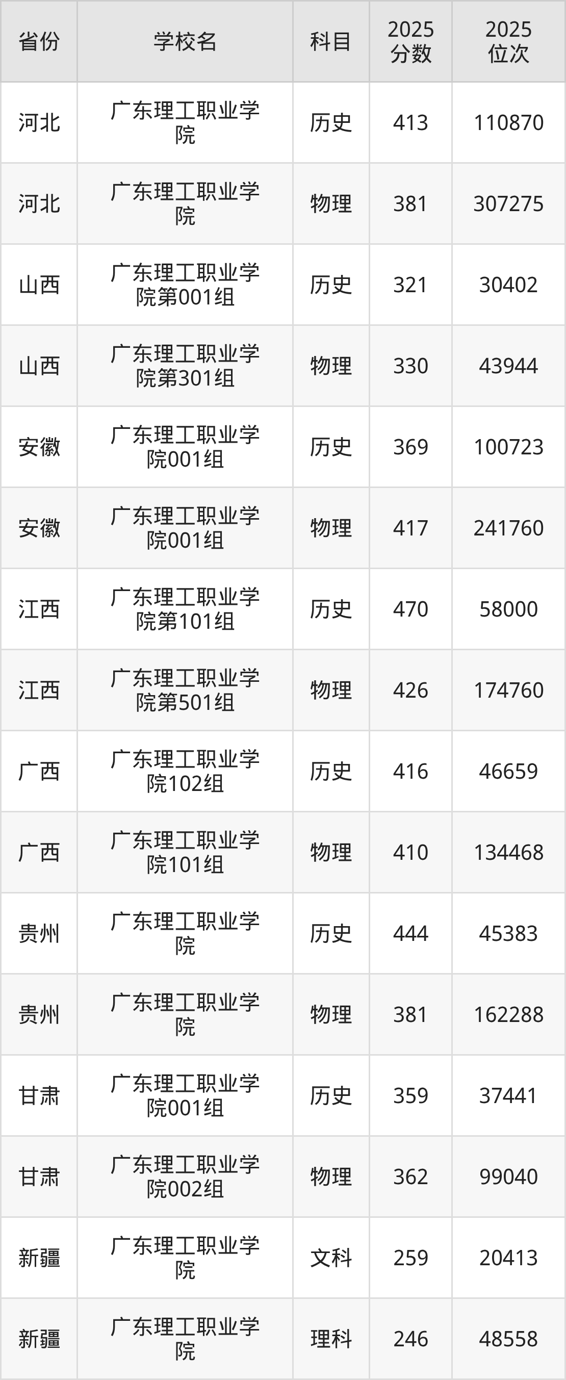 2025年广东理工职业学院历史类最低分428分(129610名)、物理类最低分380分(346108名)。