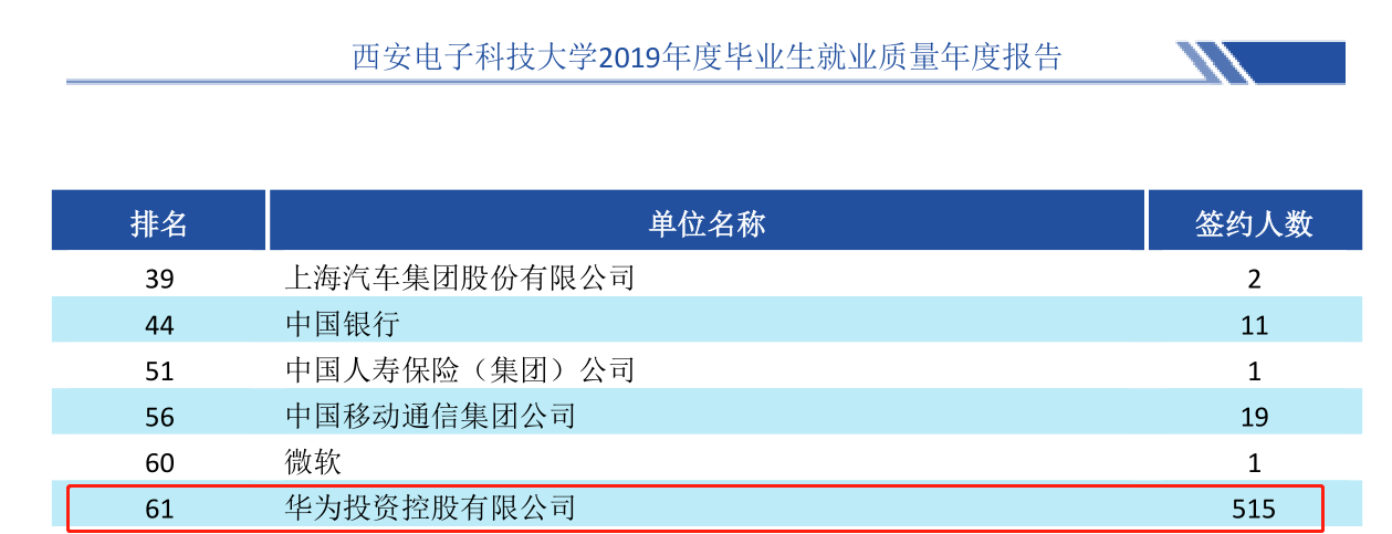 1、西安电子科技大学:2019年,华为共计在该校招收515名毕业生。
