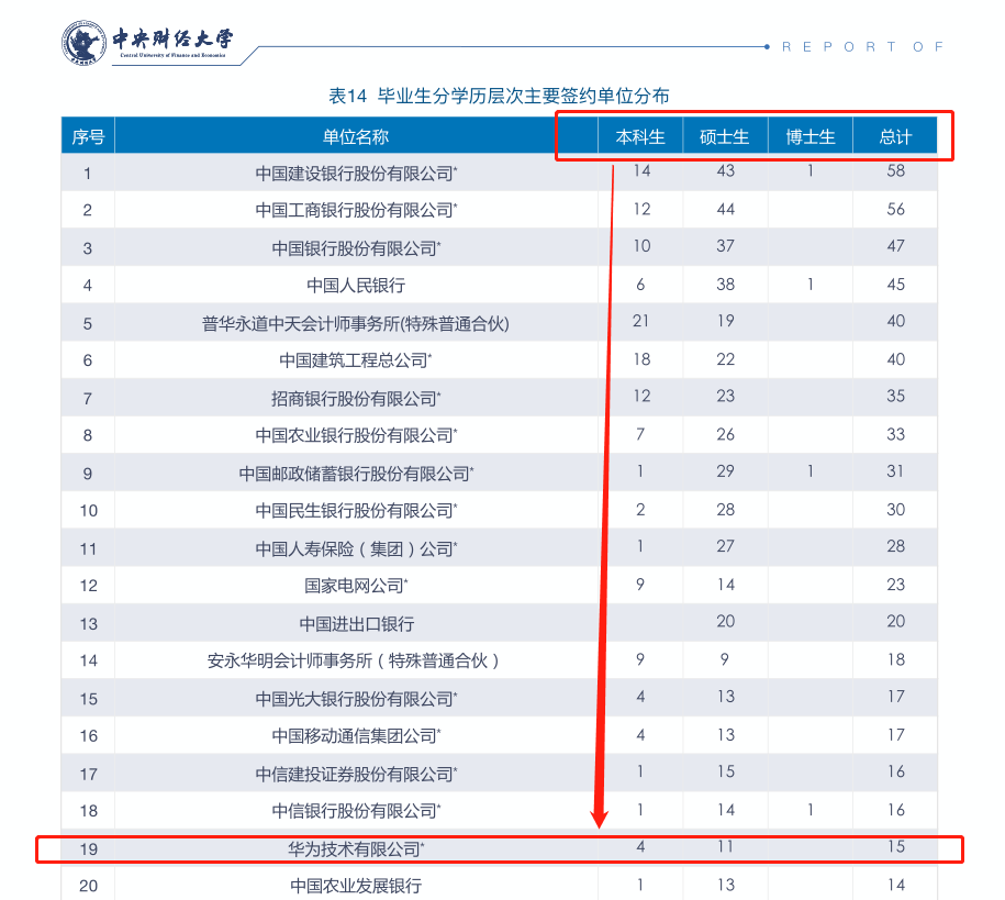 8、中央财经大学:2019年,华为共计在该校招收15名毕业生。