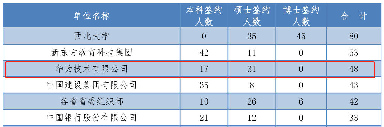 6、西北大学:2019年,华为共计在该校招收48名毕业生。