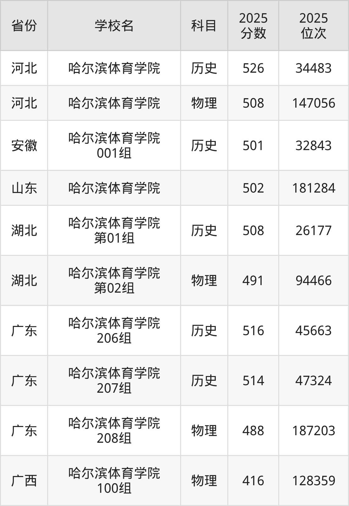 2025年哈尔滨体育学院在省内分历史物理科目类录取,其中历史类最低分是450分、对应位次是15000名;物理类最低分是417分,对应位次是62893名。