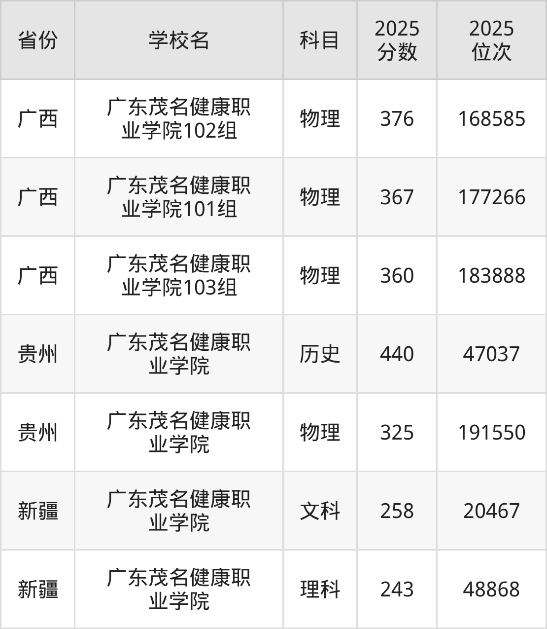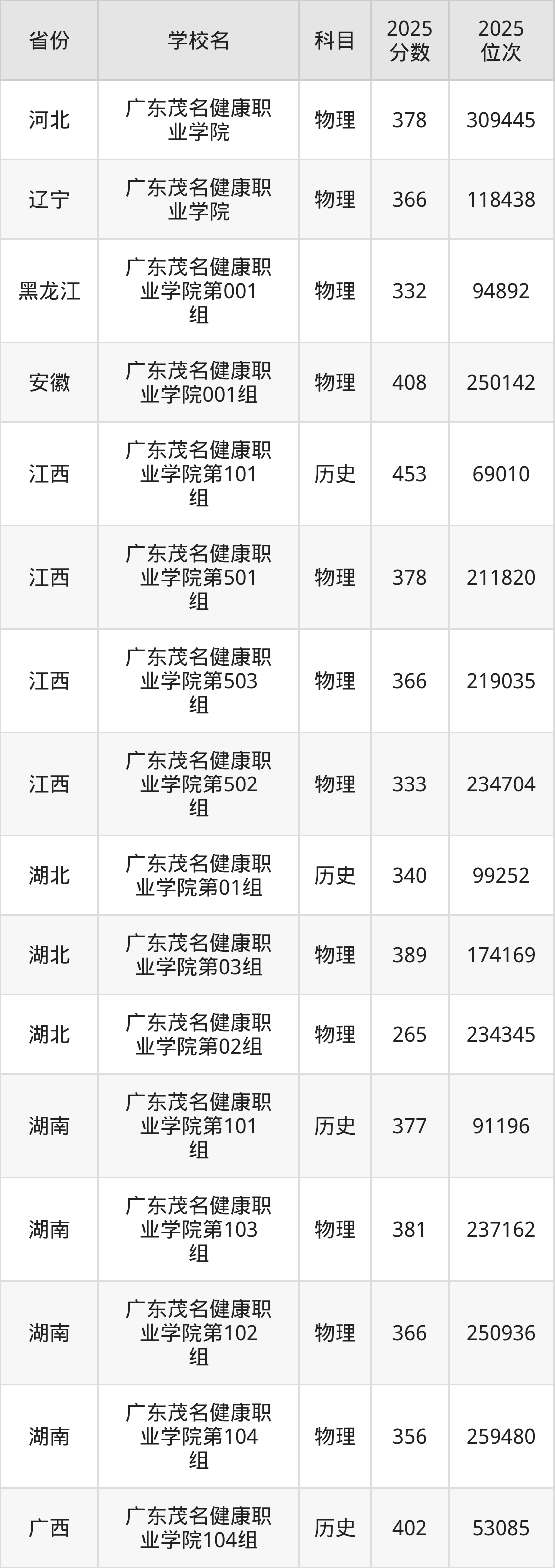 2025年广东茂名健康职业学院历史类最低分398分(163023名)、物理类最低分356分(368875名)。