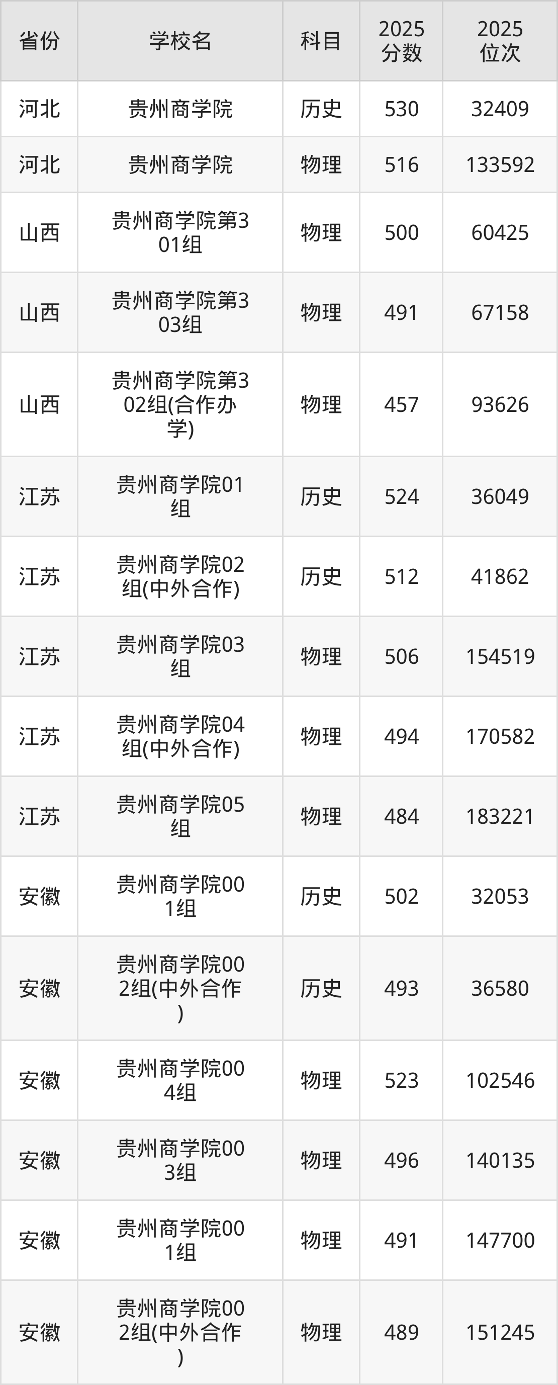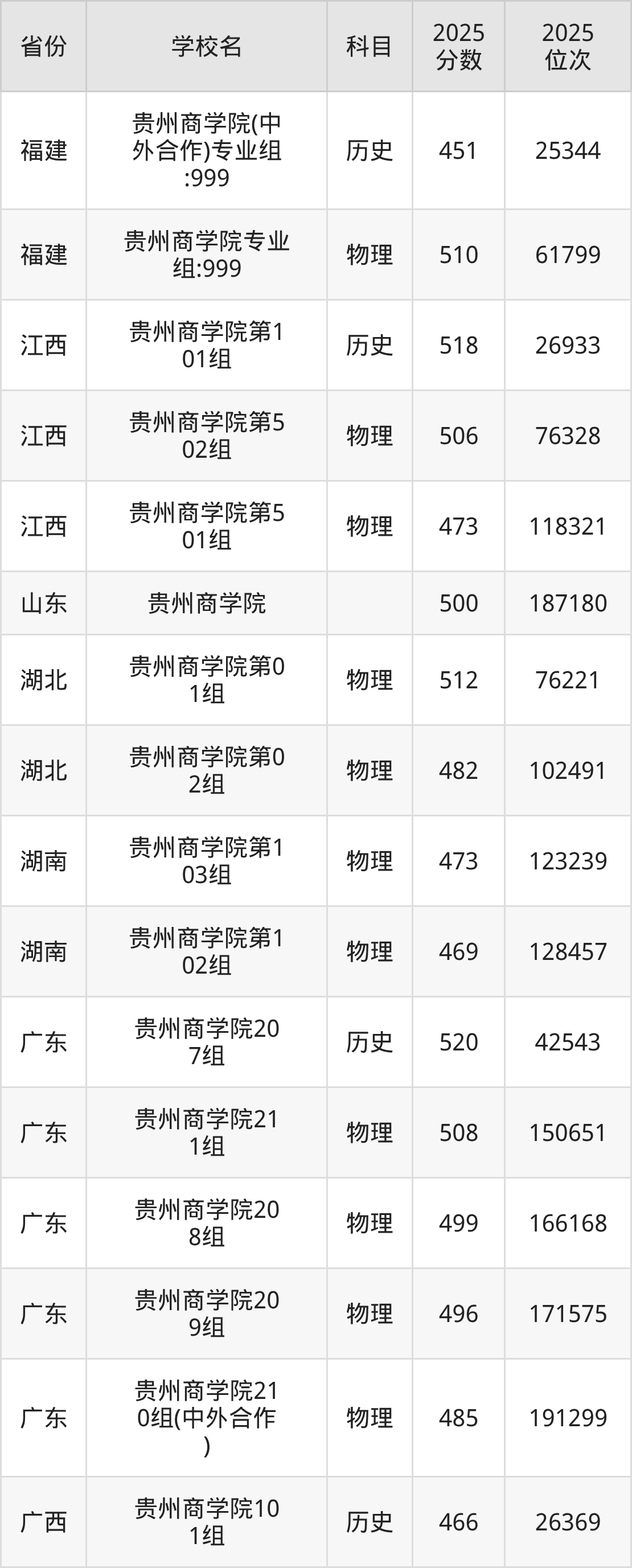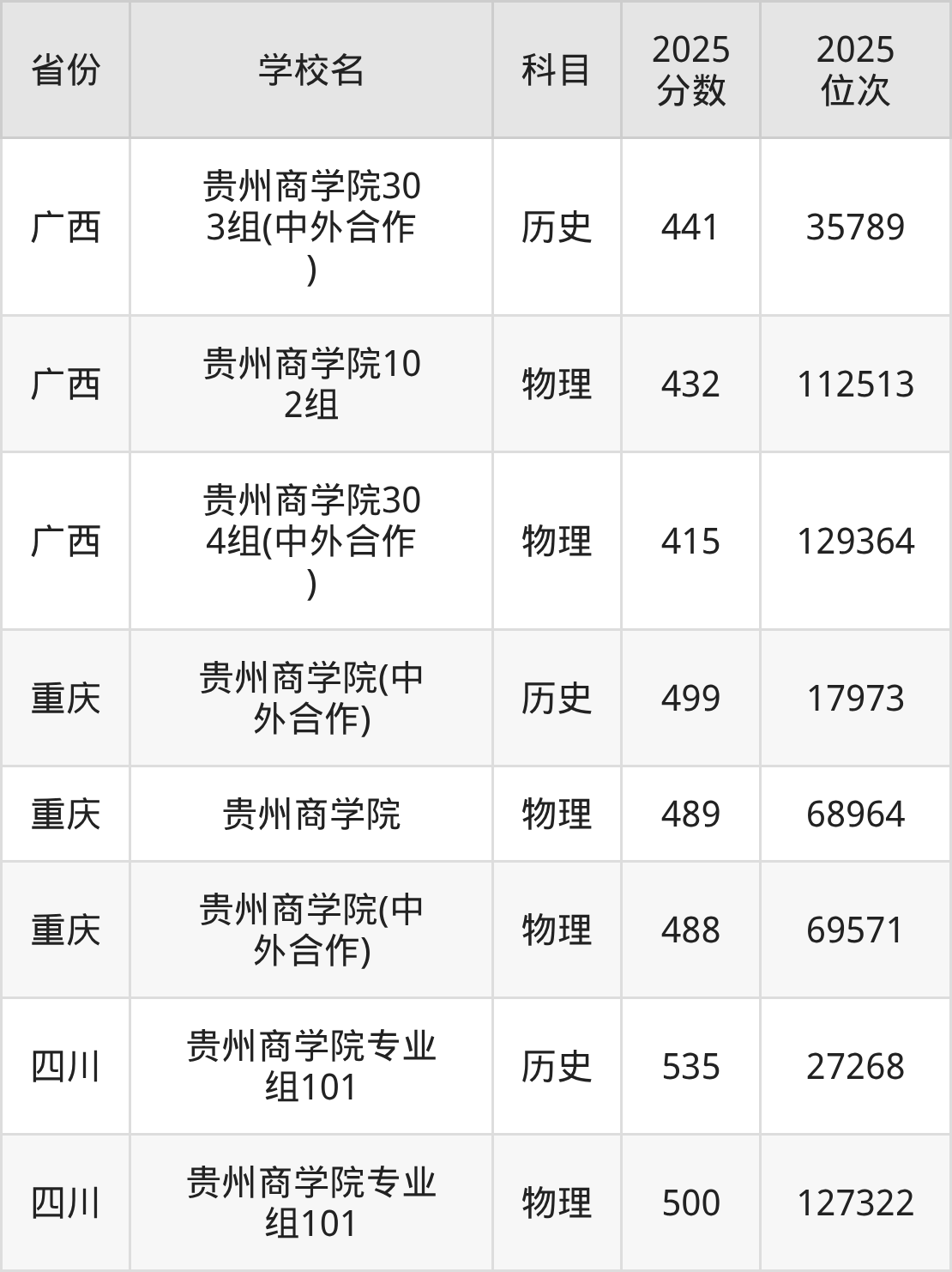 2025年贵州商学院历史类最低分471分(33275名)、物理类最低分424分(122889名)。