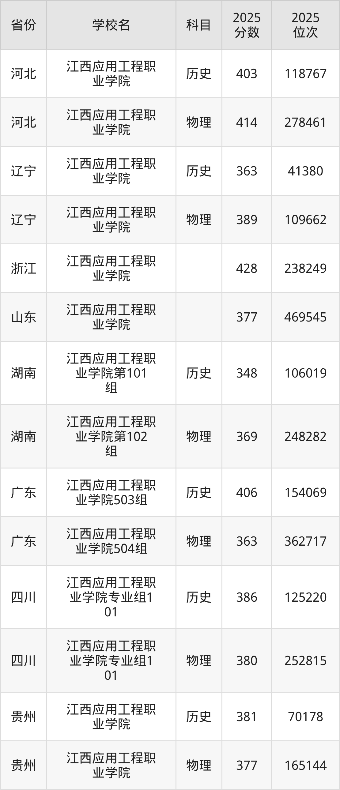 2026年江西应用工程职业学院录取分数线预计在370分及以上,在各省录取最低分存在一定差异,如:2025年江西应用工程职业学院在河北录取最低历史类403分、物理类414分,在湖南录取最低历史类348分、物理类369分,在四川录取最低历史类386分、物理类380分。