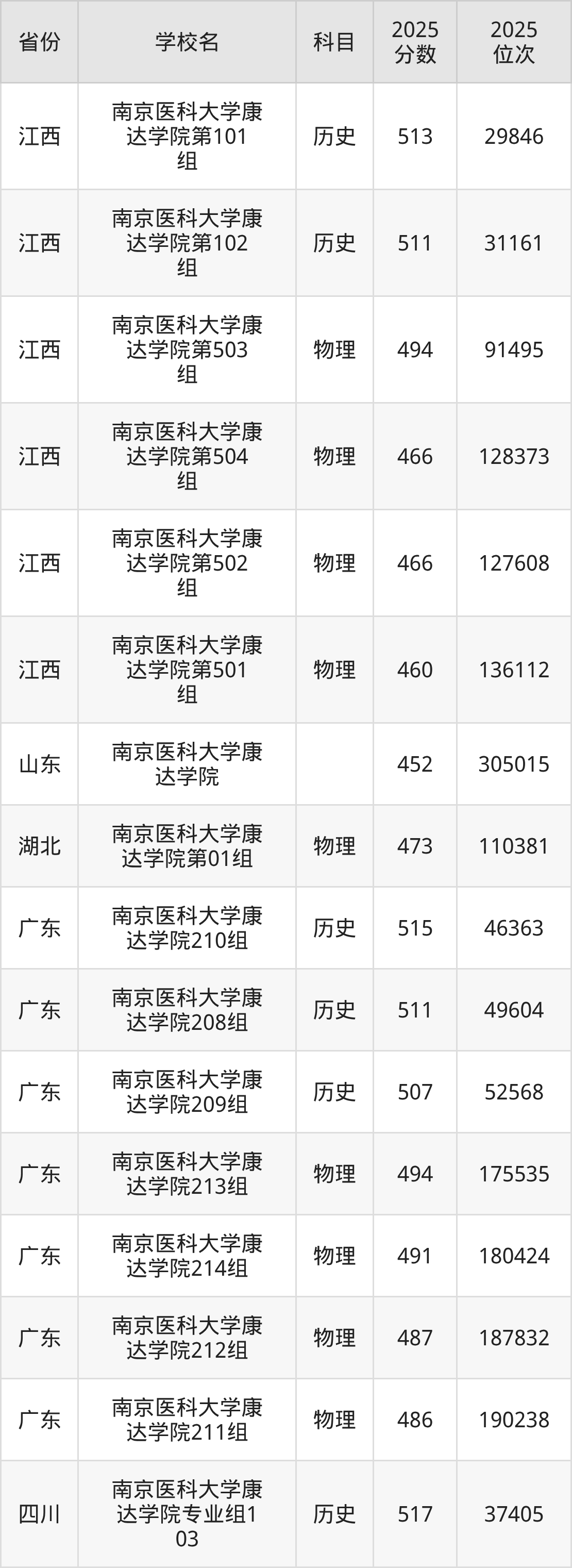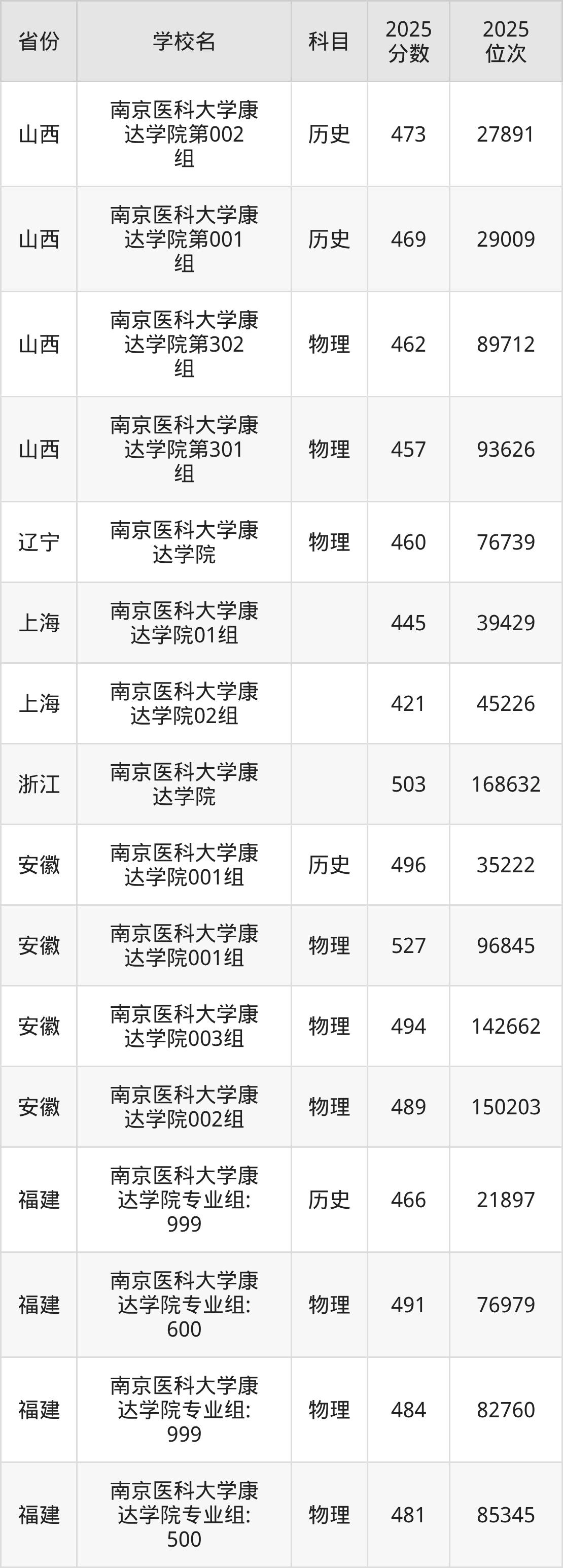 2025年南京医科大学康达学院历史类最低分493分(50998名)、物理类最低分490分(175732名)。