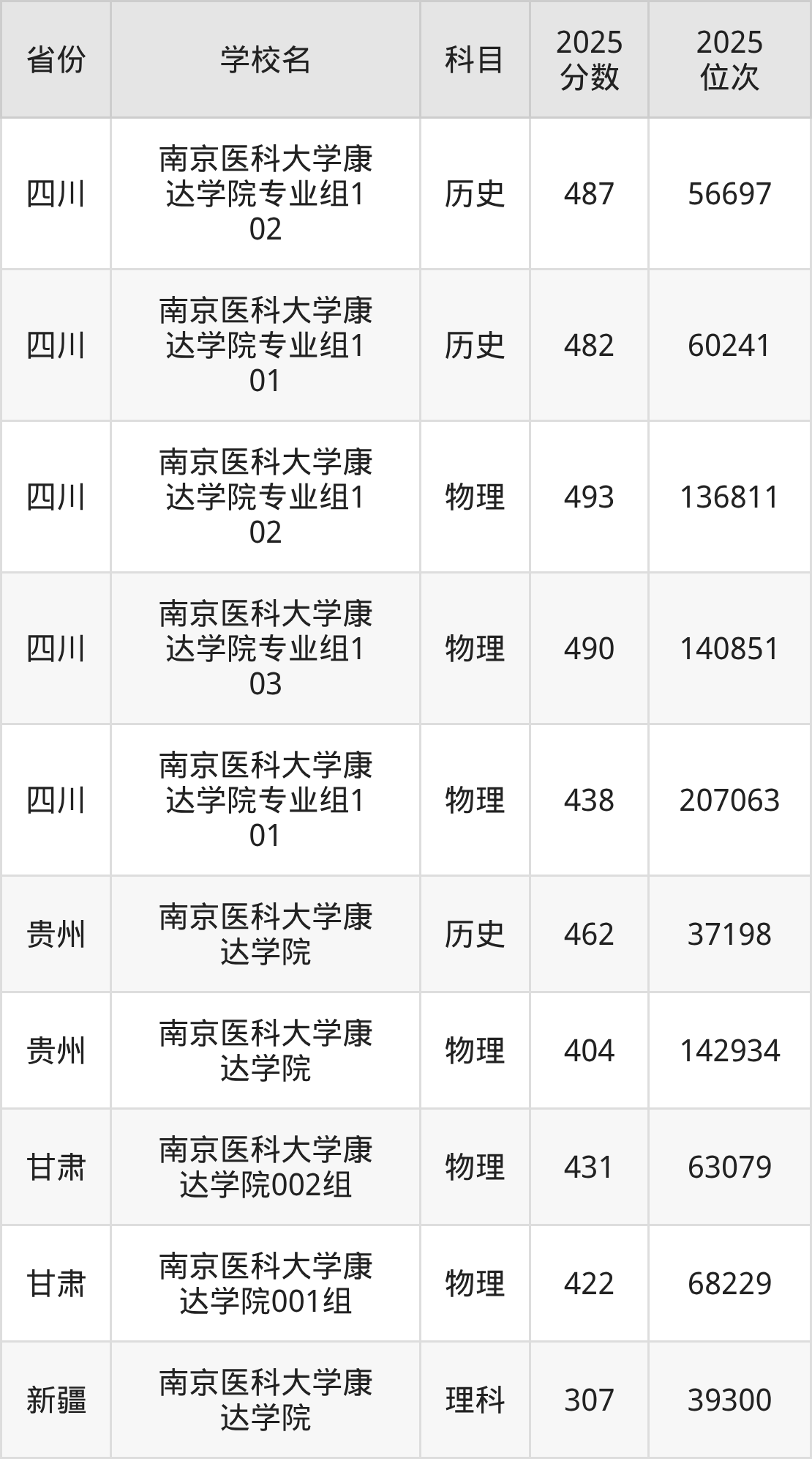 2025年南京医科大学康达学院在省内分历史物理科目类录取,其中历史类最低分是493分、对应位次是50998名;物理类最低分是490分,对应位次是175732名。