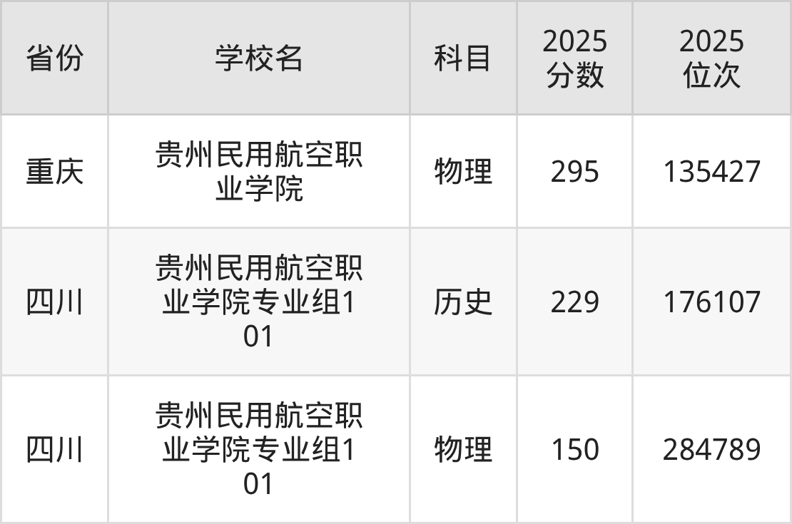 2025年贵州民用航空职业学院在省内分历史物理科目类录取,其中历史类最低分是183分、对应位次是88395名;物理类最低分是186分,对应位次是204962名。
