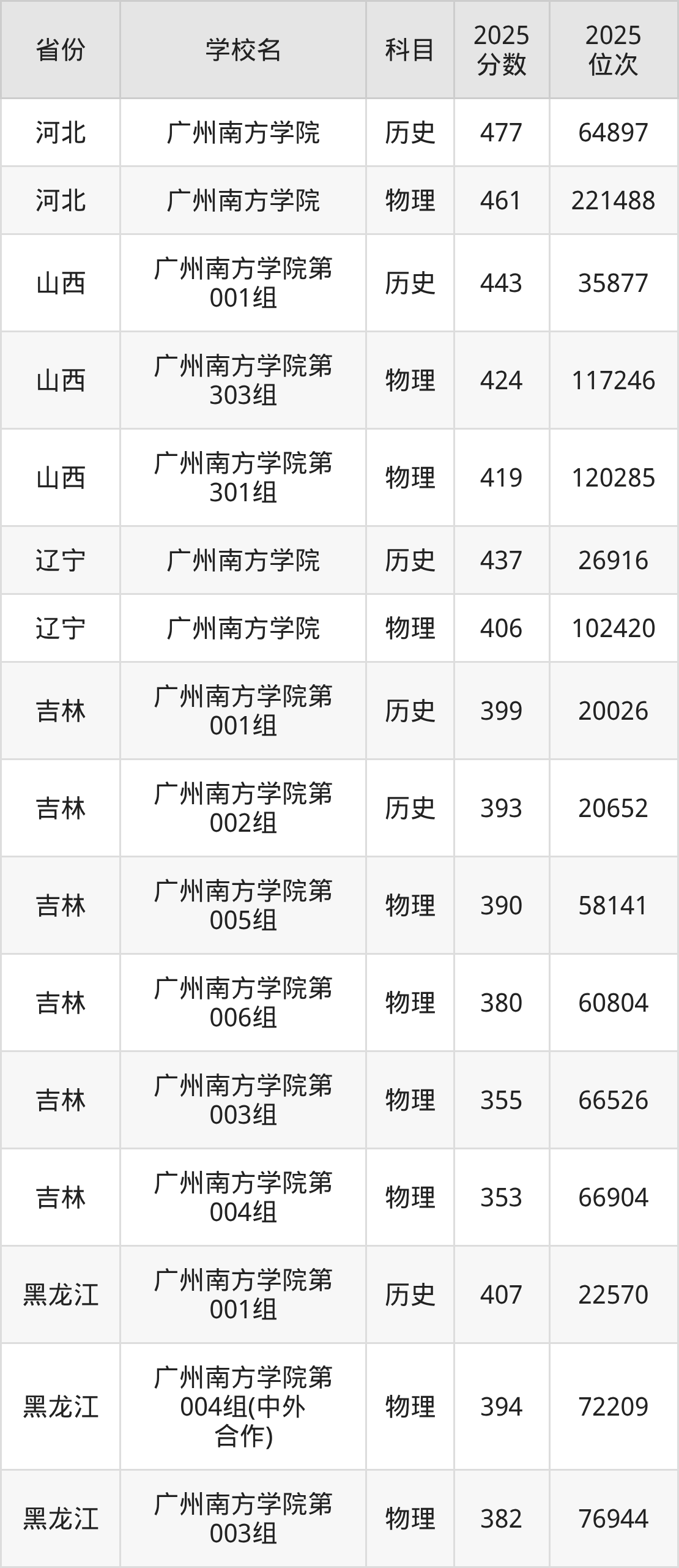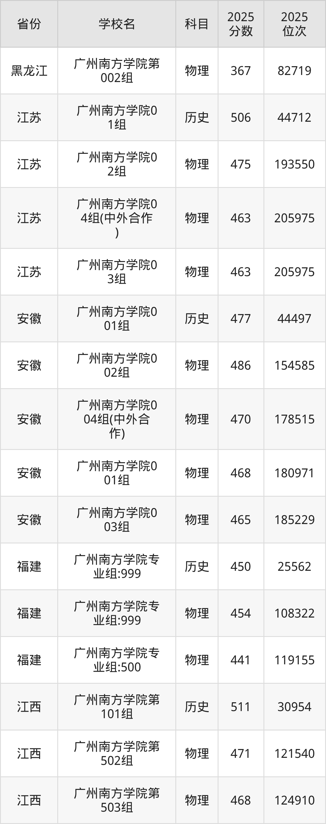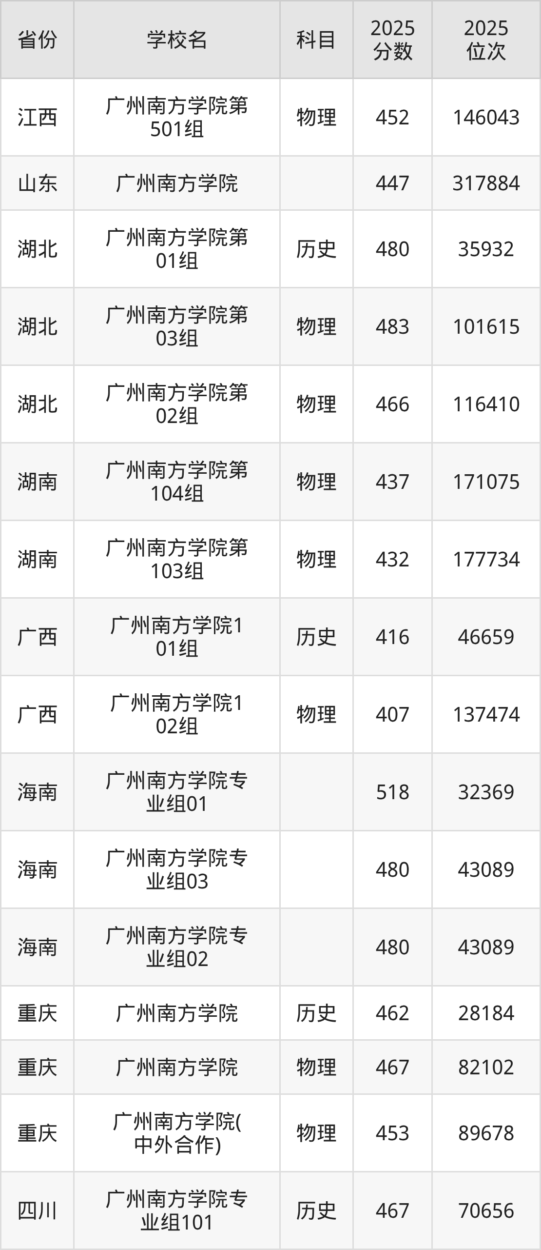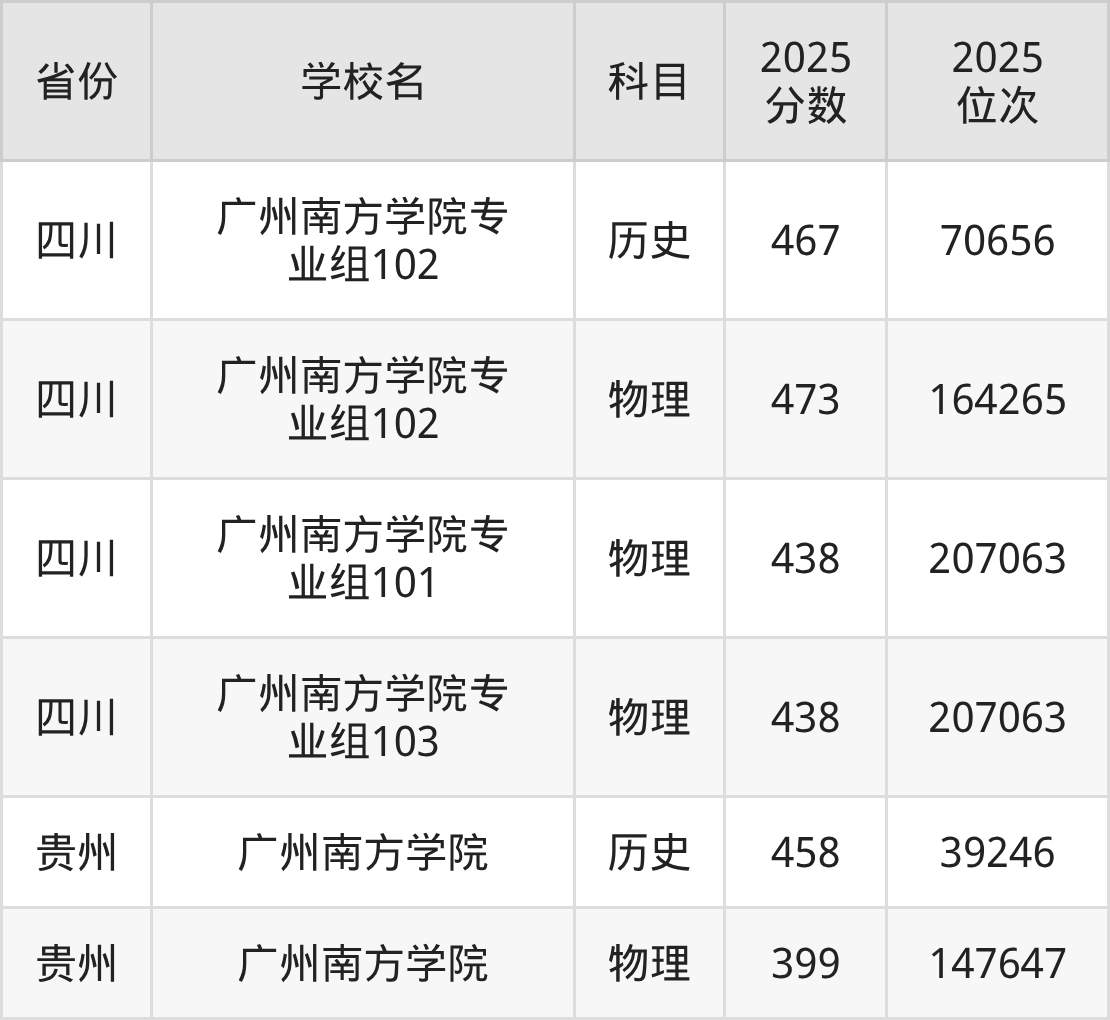 2025年广州南方学院历史类最低分464分(91580名)、物理类最低分436分(276021名)。