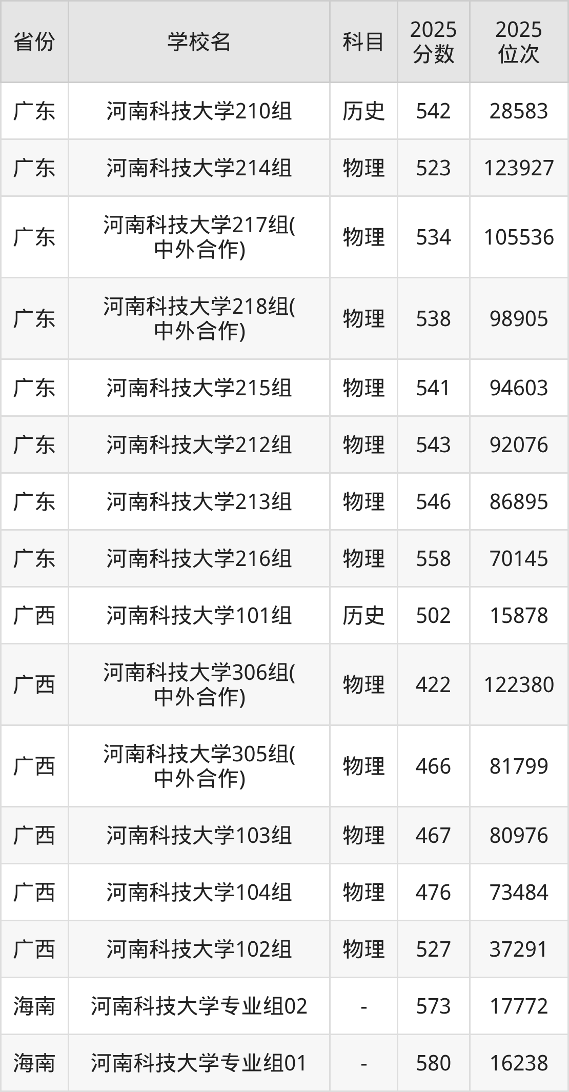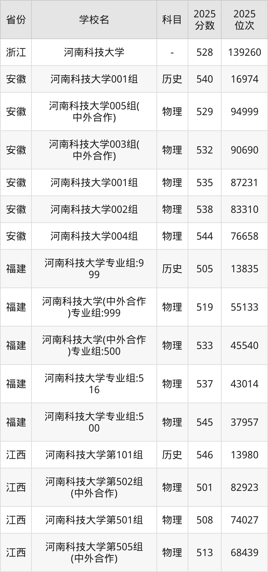 | 河南科技大学第 301组(国家 专项计划组) | 物理 | 597 | 49305 |