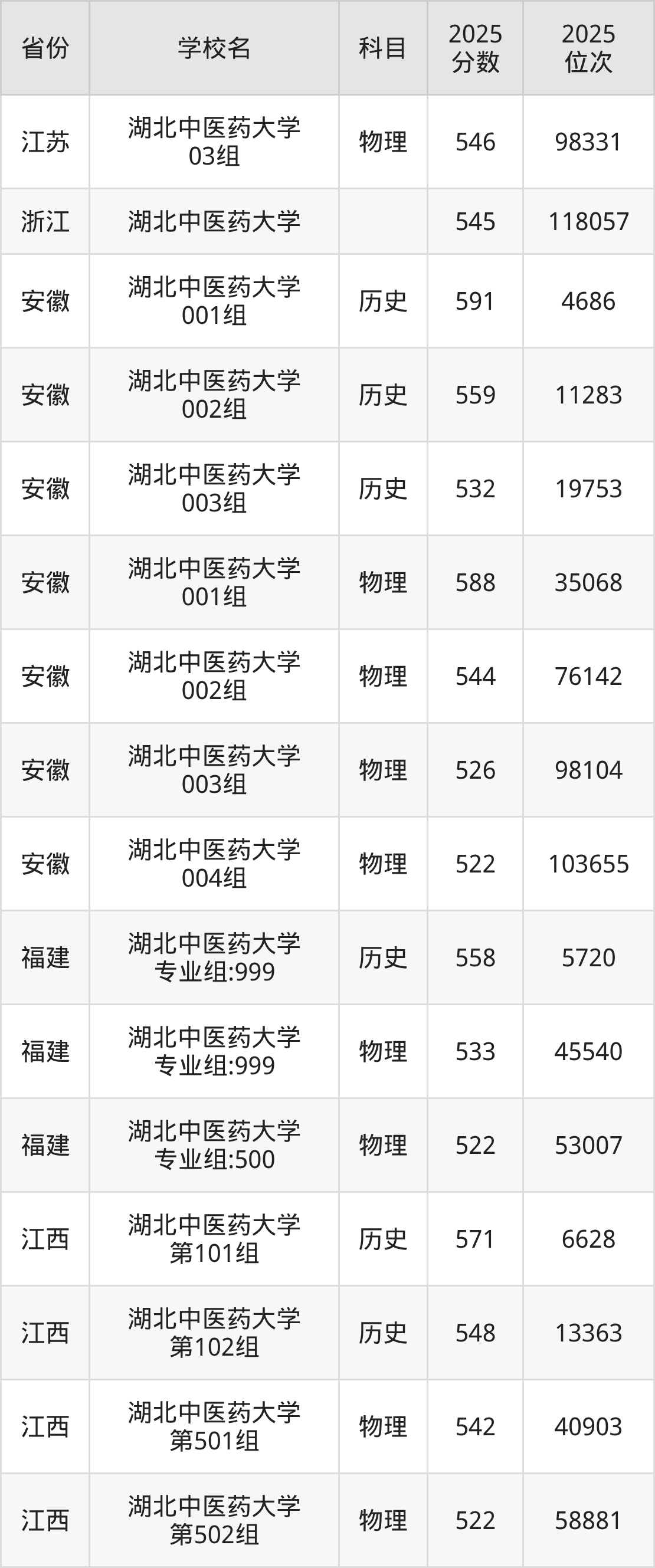 | 湖北中医药大学 第15组(国家 专项) | 物理 | 546 | 47563 |