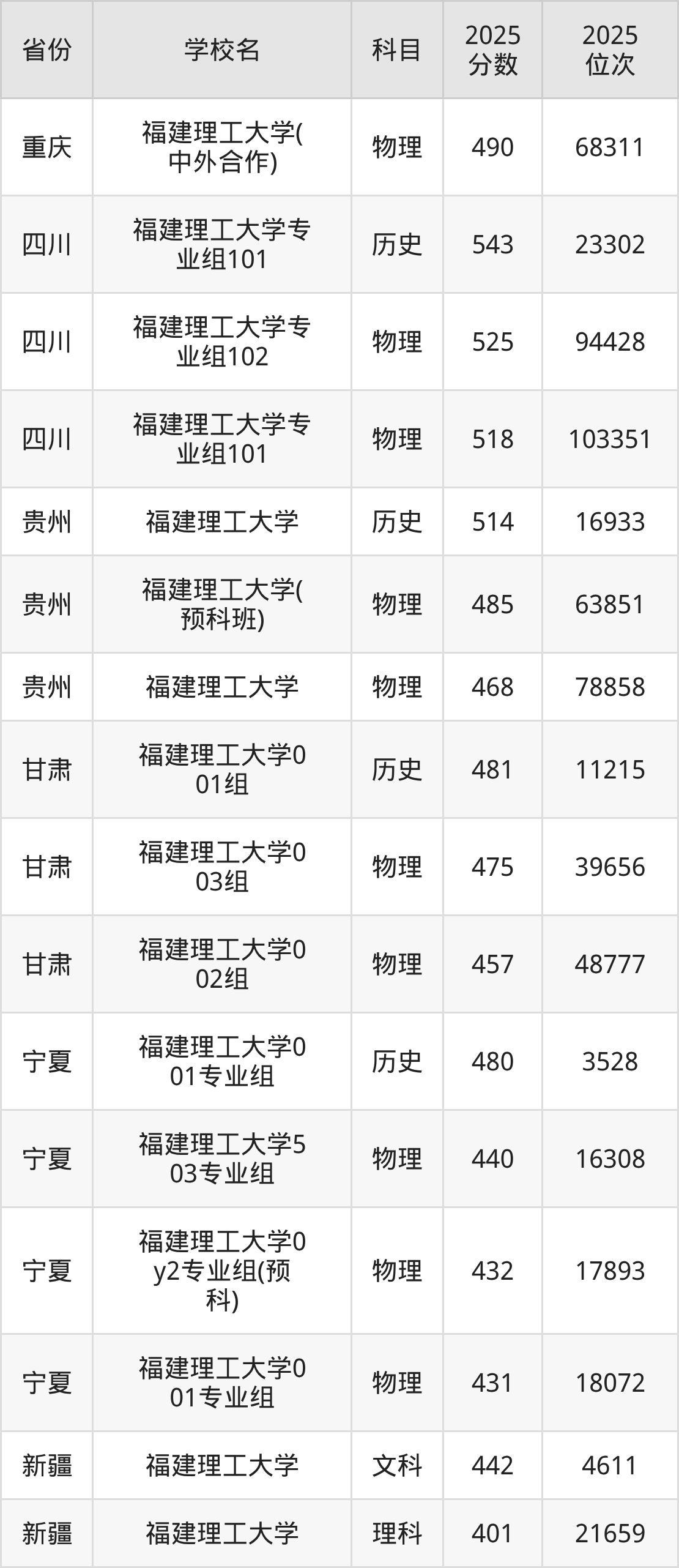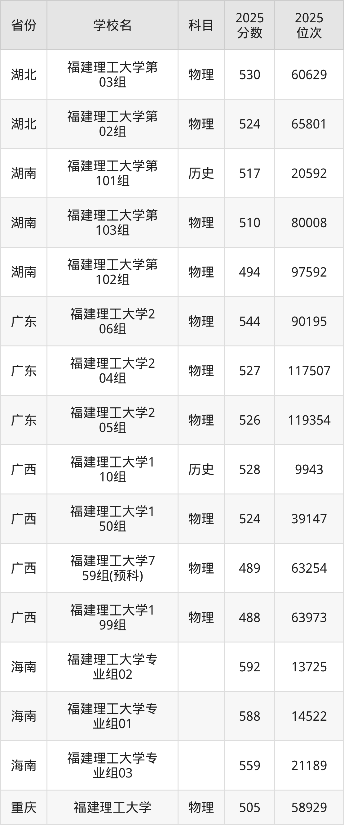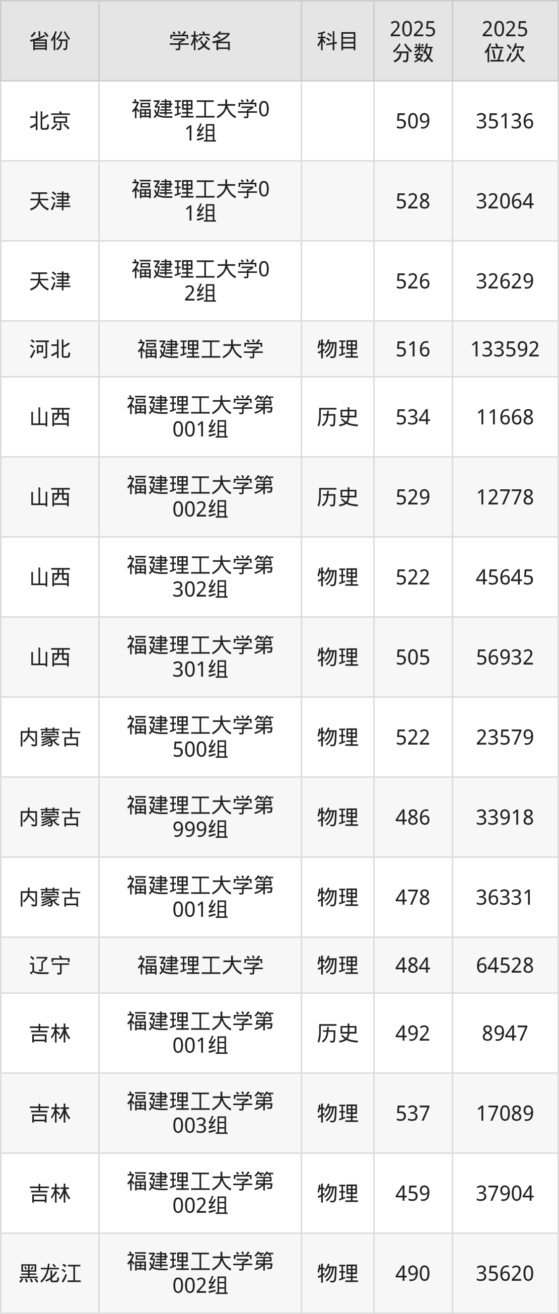 2025年福建理工大学历史类最低分515分(12078名)、物理类最低分514分(58785名)。