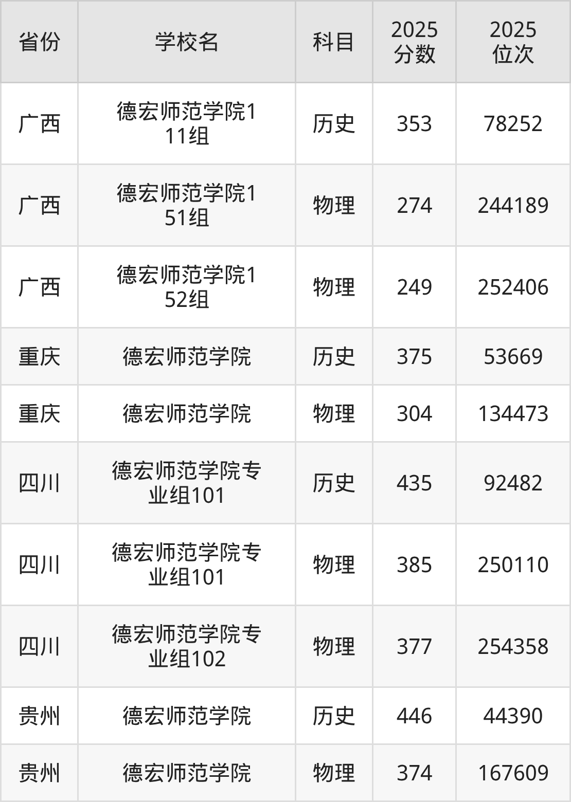 2026年德宏师范学院录取分数线预计在350分及以上,在各省录取最低分存在一定差异,如:2025年德宏师范学院在广西录取最低历史类353分、物理类249分,在重庆录取最低历史类375分、物理类304分,在四川录取最低历史类435分、物理类377分。