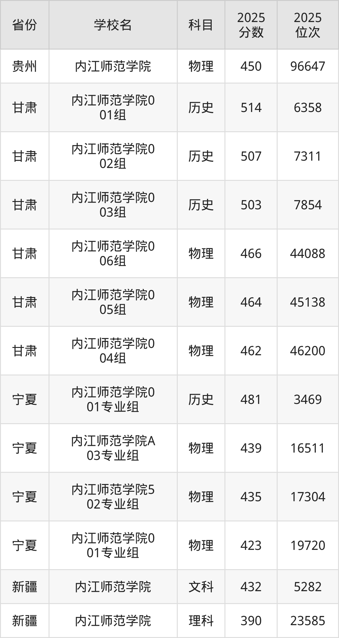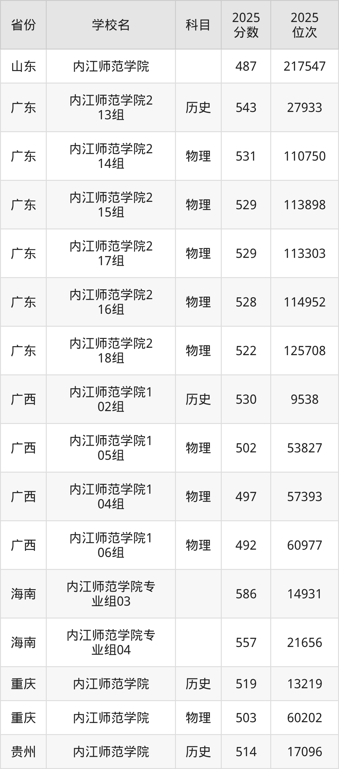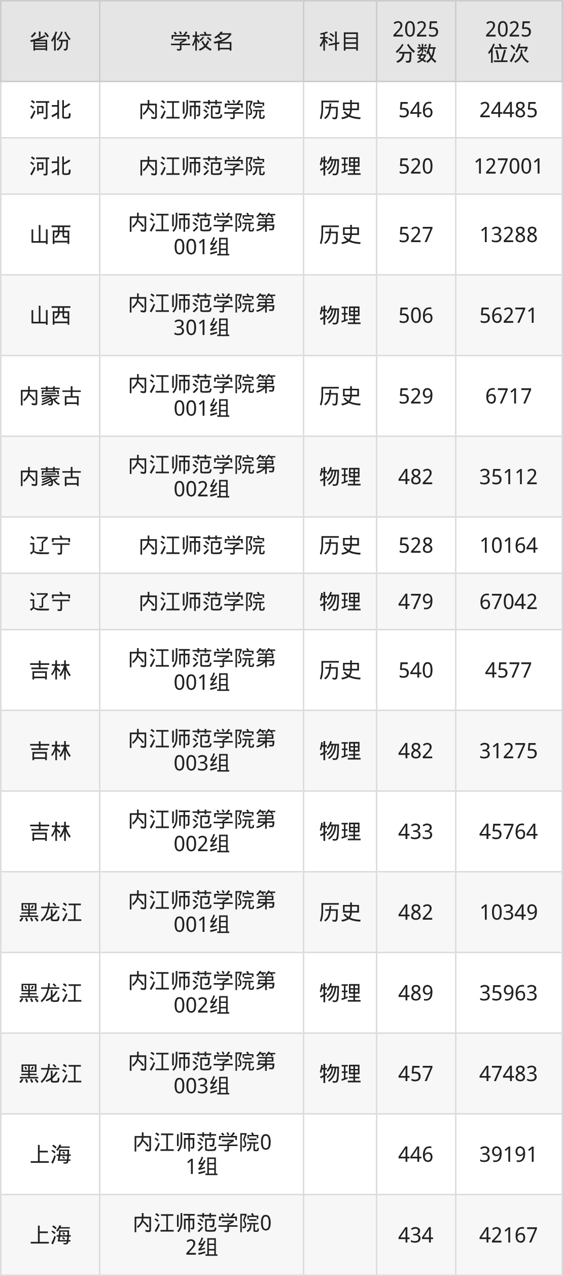 2025年内江师范学院在省内分历史物理科目类录取,其中历史类最低分是543分、对应位次是23302名;物理类最低分是489分,对应位次是142200名。