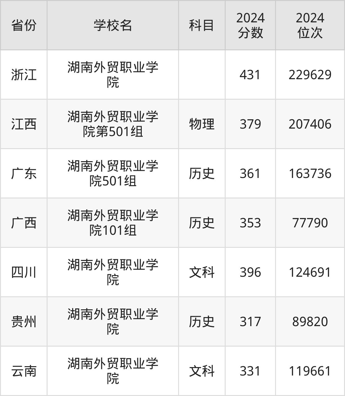 2025年湖南外贸职业学院录取分数线预计在360分及以上,在各省录取最低分存在一定差异,如:2024年湖南外贸职业学院在广东录取最低历史类361分,在广西录取最低历史类353分,在四川录取最低文科396分。