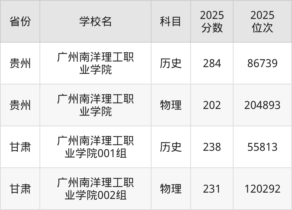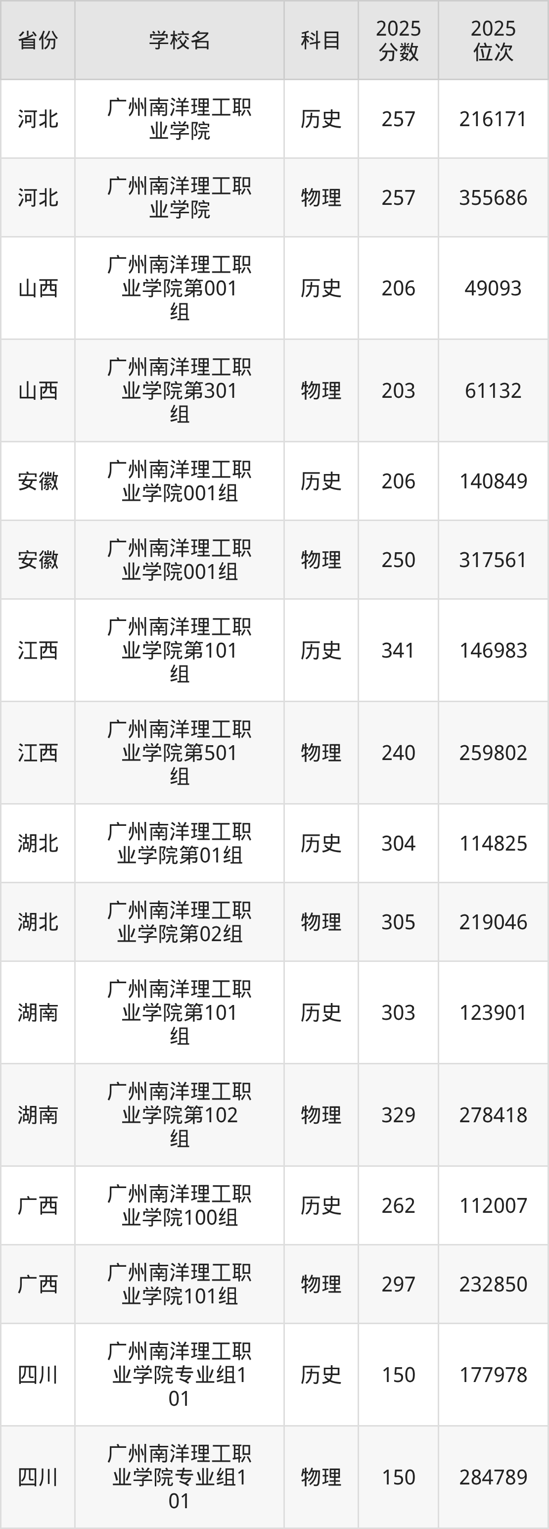 2025年广州南洋理工职业学院在省内分历史物理科目类录取,其中历史类最低分是223分、对应位次是286353名;物理类最低分是206分,对应位次是436785名。