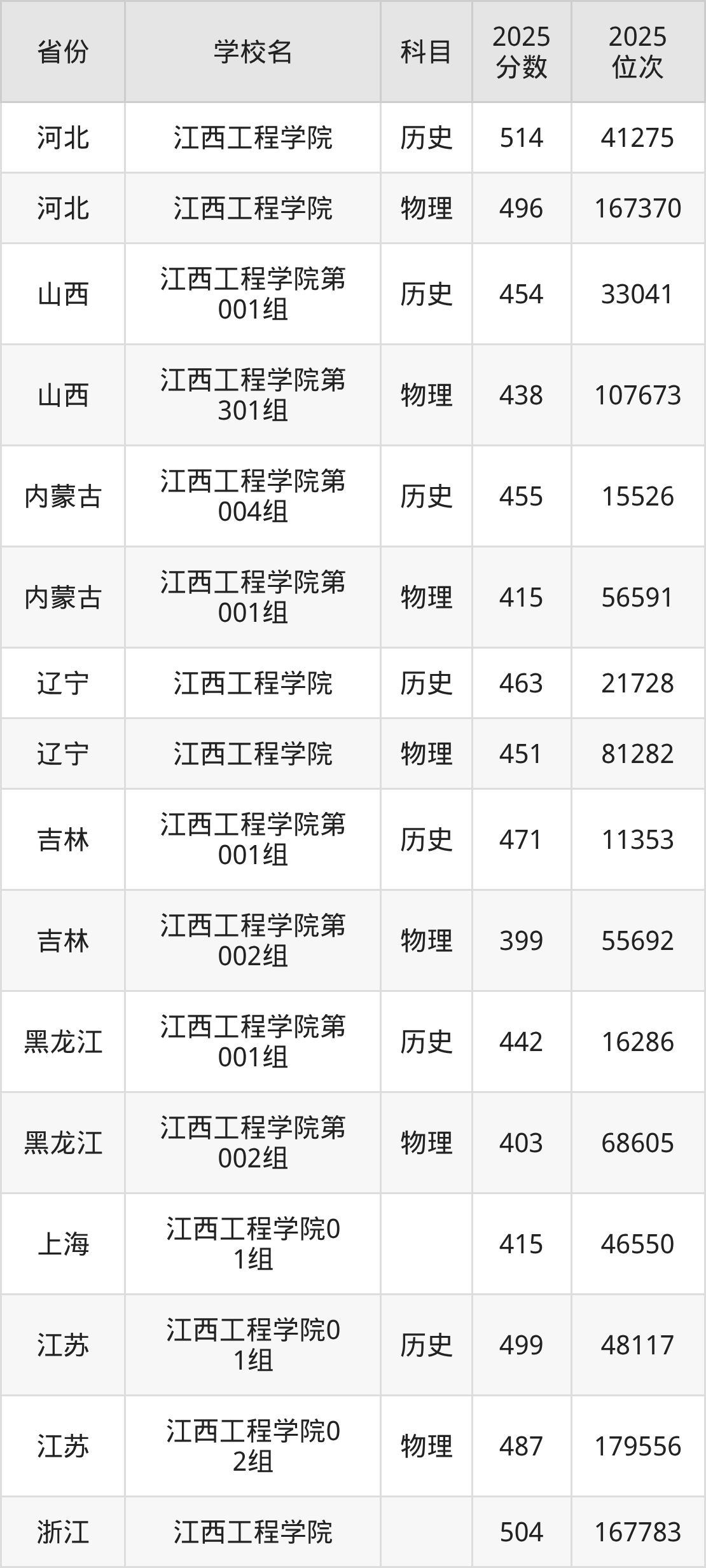 2025年江西工程学院历史类最低分501分(37256名)、物理类最低分448分(150856名)。