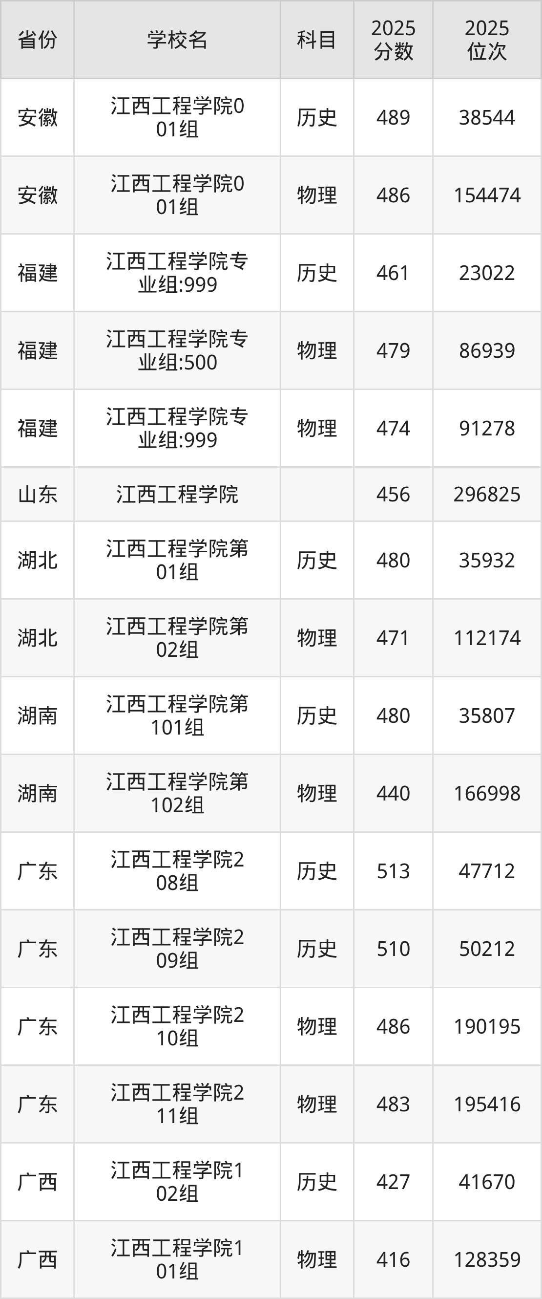 2025年江西工程学院在省内分历史物理科目类录取,其中历史类最低分是501分、对应位次是37256名;物理类最低分是448分,对应位次是150856名。