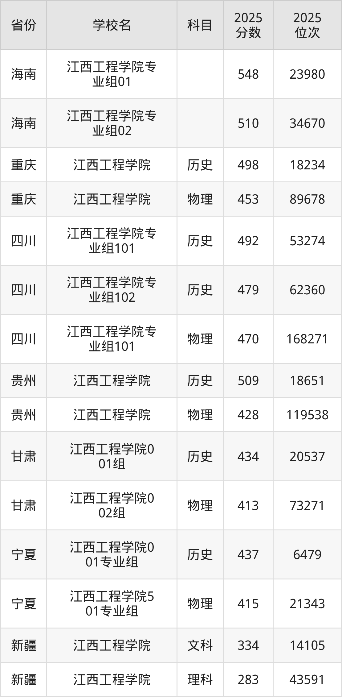2025年江西工程学院在省外录取分数线范围整体位于283分到548分之间,录取分数线最低在新疆理科、录取分数线最高在海南(专业组01)。