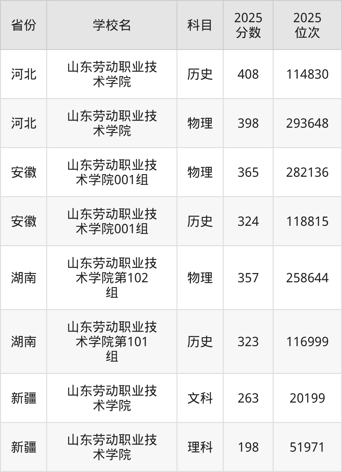 2026年山东劳动职业技术学院录取分数线预计在320分及以上,在各省录取最低分存在一定差异,如:2025年山东劳动职业技术学院在山东录取最低分是322分,在湖南录取最低历史类323分、物理类357分,在新疆录取最低文科263分、理科198分。