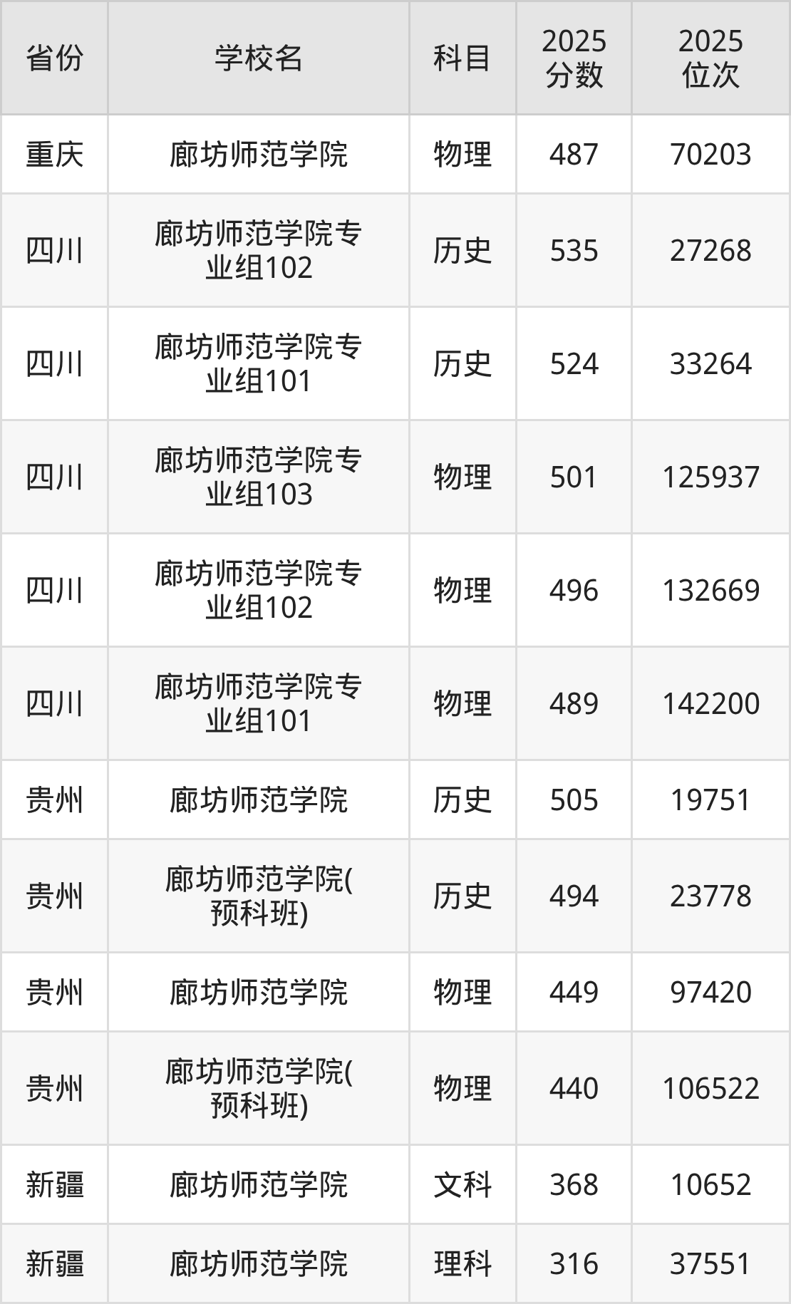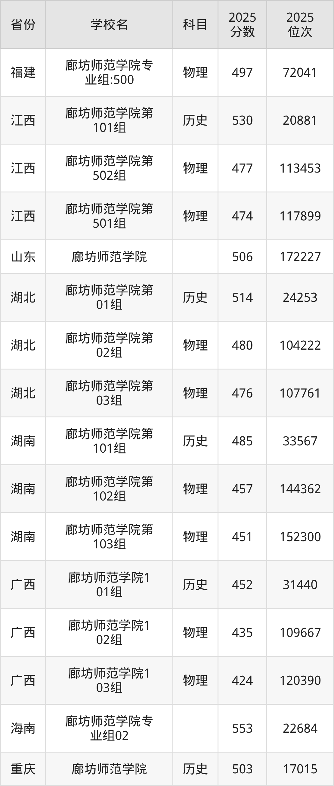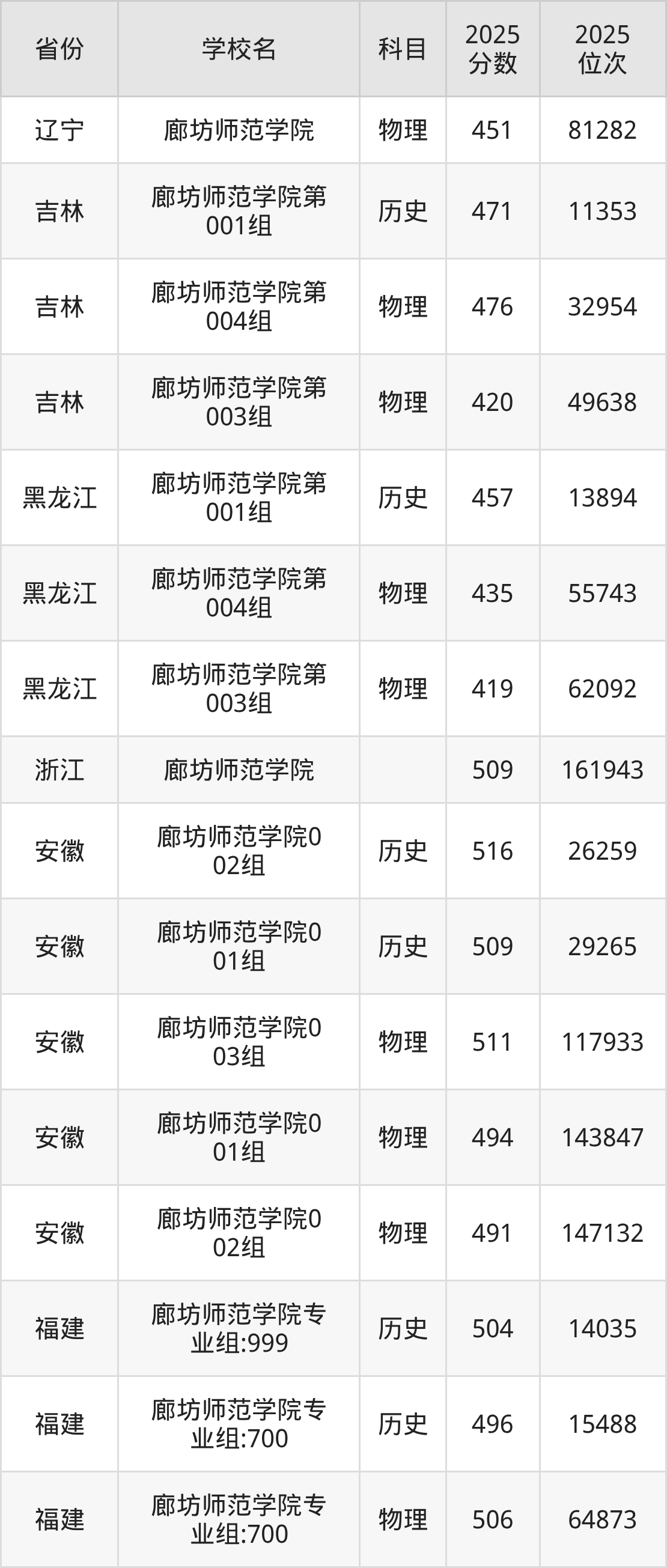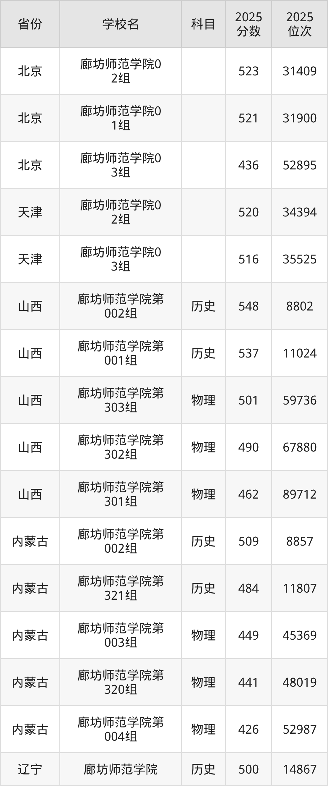 2025年廊坊师范学院历史类最低分503分(47901名)、物理类最低分493分(172221名)。