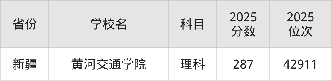 2025年黄河交通学院在省外录取分数线是287分,录取分数线最低在新疆理科。