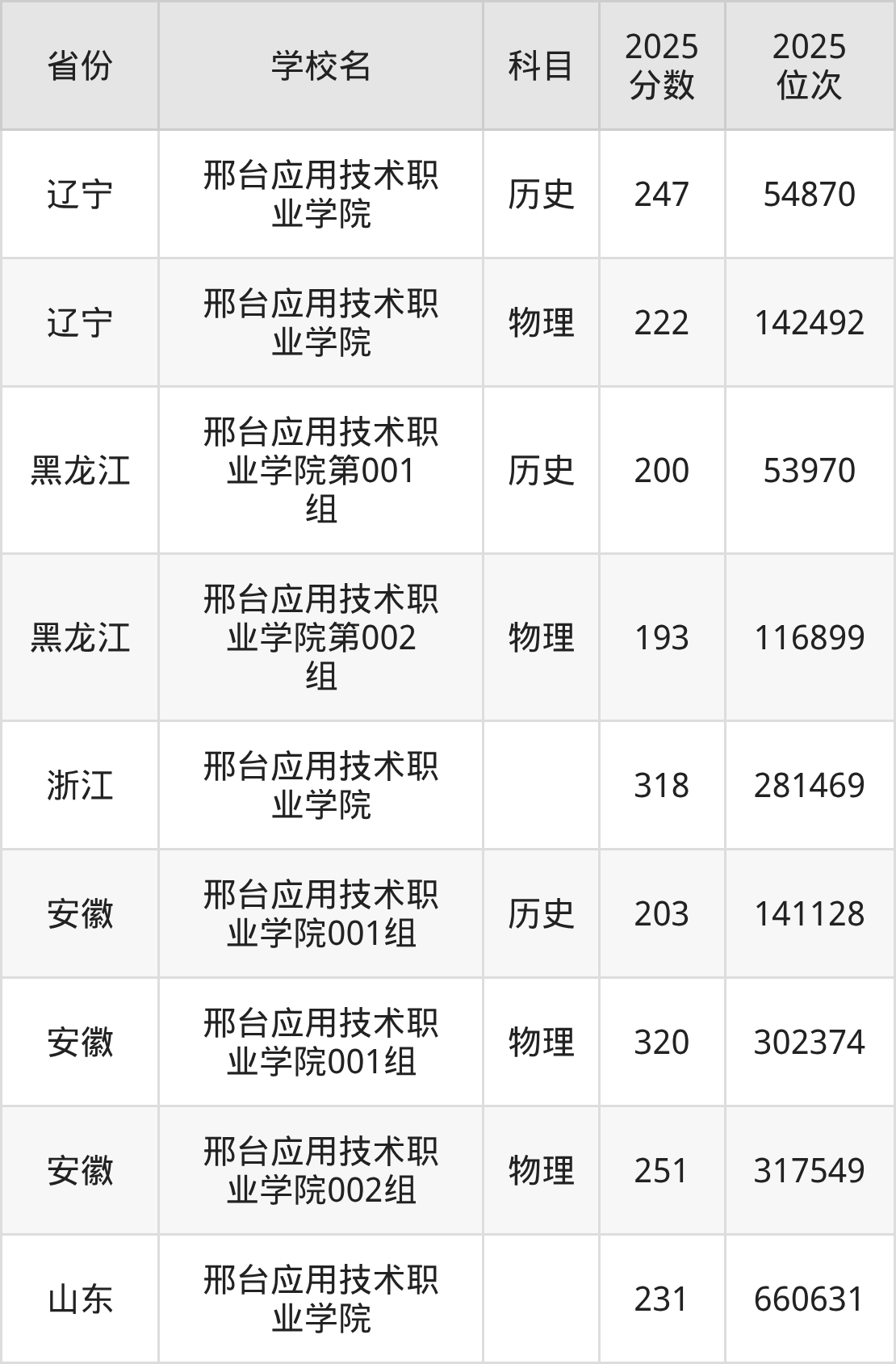 2025年邢台应用技术职业学院历史类最低分260分(214808名)、物理类最低分200分(361477名)。