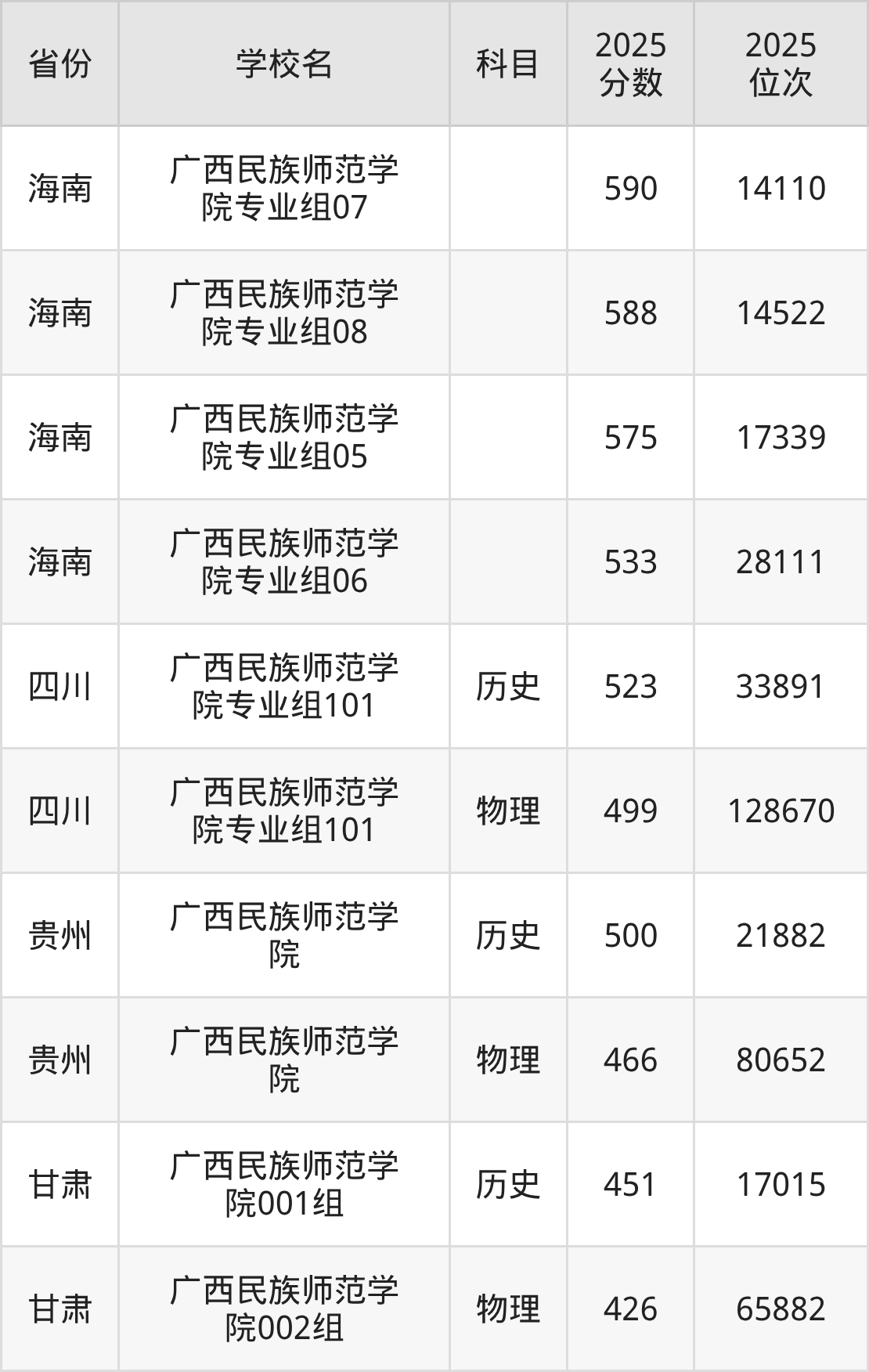 2025年广西民族师范学院在壮族自治区内分历史物理科目类录取,其中历史类最低分是453分、对应位次是31058名;物理类最低分是418分,对应位次是126378名。
