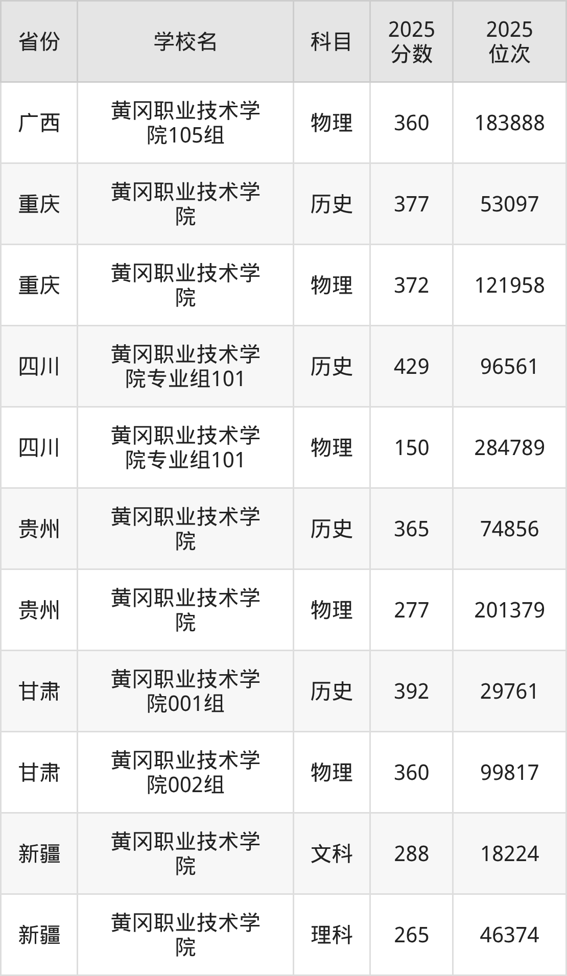 2025年黄冈职业技术学院历史类最低分329分(104308名)、物理类最低分336分(204107名)。