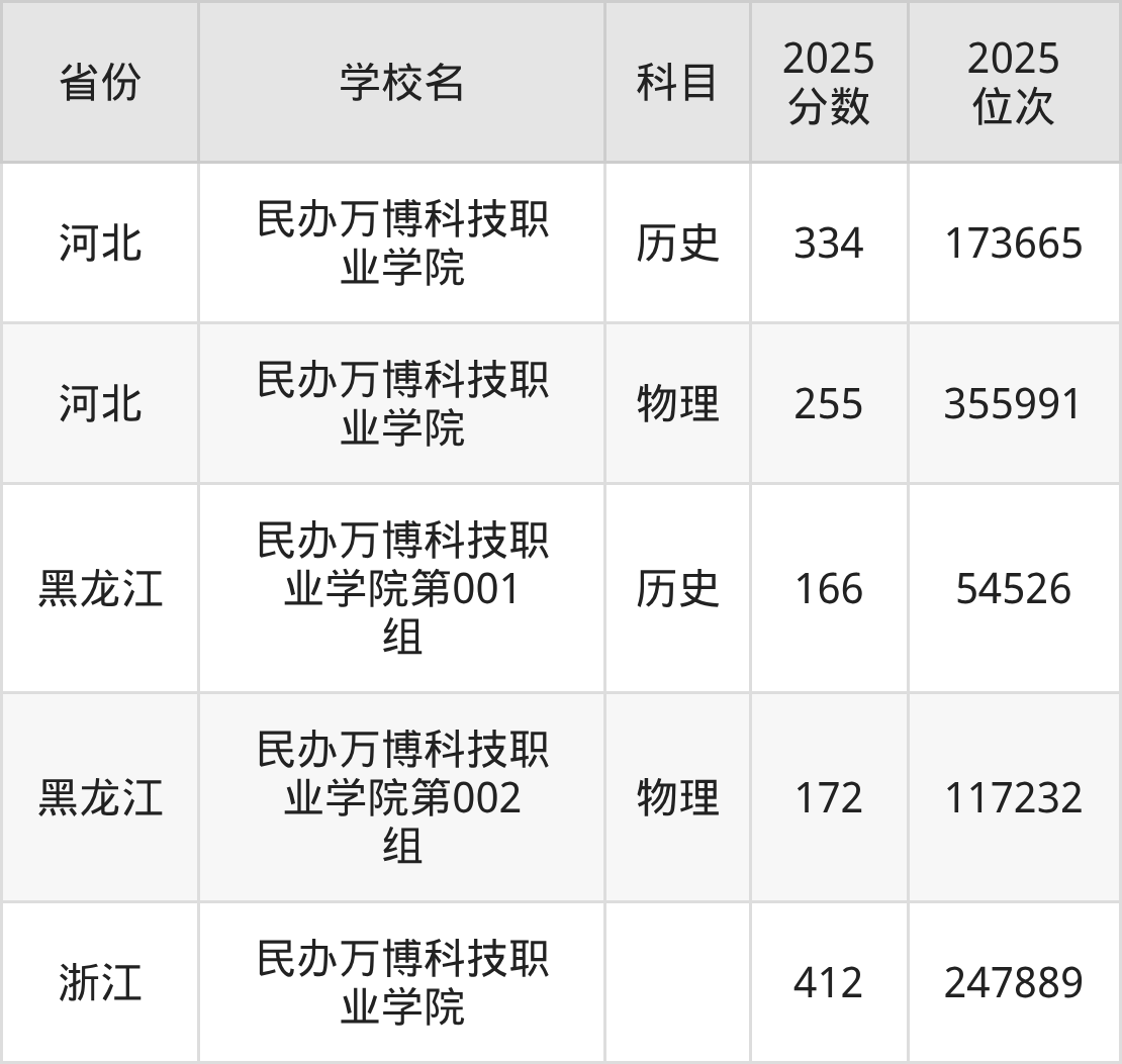 2025年民办万博科技职业学院在省内分历史物理科目类录取,其中历史类最低分是268分、对应位次是132375名;物理类最低分是203分,对应位次是320681名。