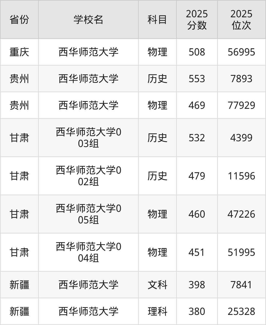 2025年西华师范大学在省内分历史物理科目类录取,其中历史类最低分是467分、对应位次是70656名;物理类最低分是438分,对应位次是207063名。