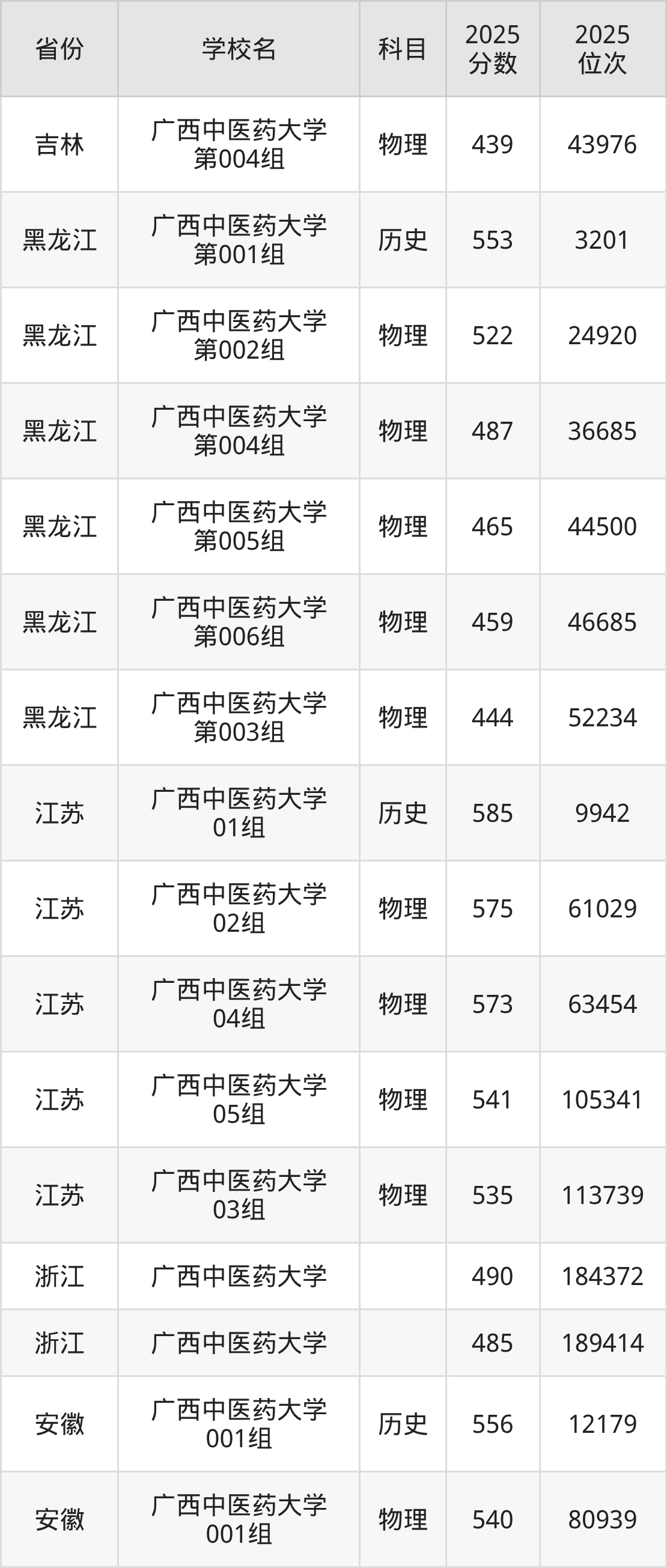 2025年广西中医药大学在壮族自治区内分历史物理科目类录取,其中历史类最低分是438分、对应位次是37007名;物理类最低分是403分,对应位次是141415名。
