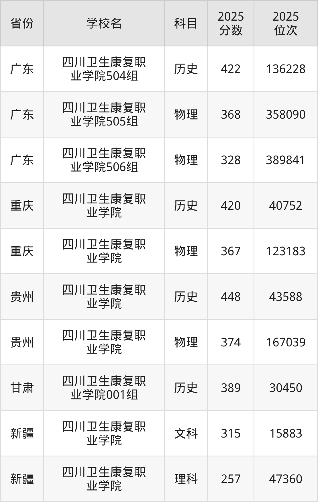 2025年四川卫生康复职业学院在省内分历史物理科目类录取,其中历史类最低分是462分、对应位次是74131名;物理类最低分是382分,对应位次是251752名。