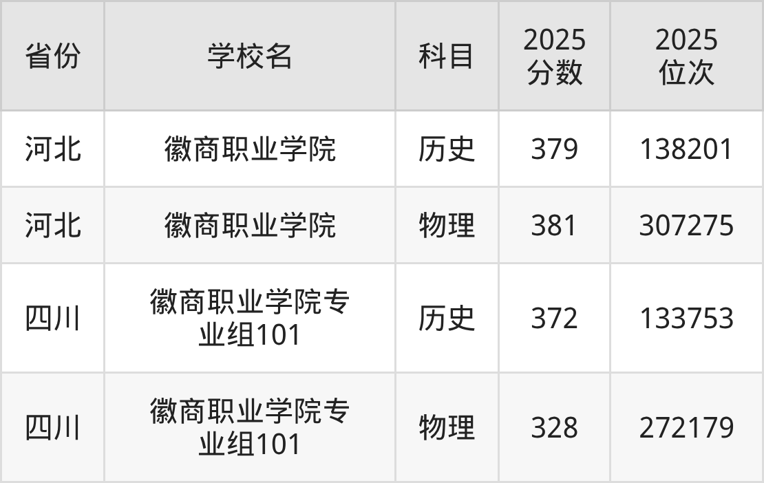 2025年徽商职业学院在省内分历史物理科目类录取,其中历史类最低分是355分、对应位次是107412名;物理类最低分是369分,对应位次是279458名。