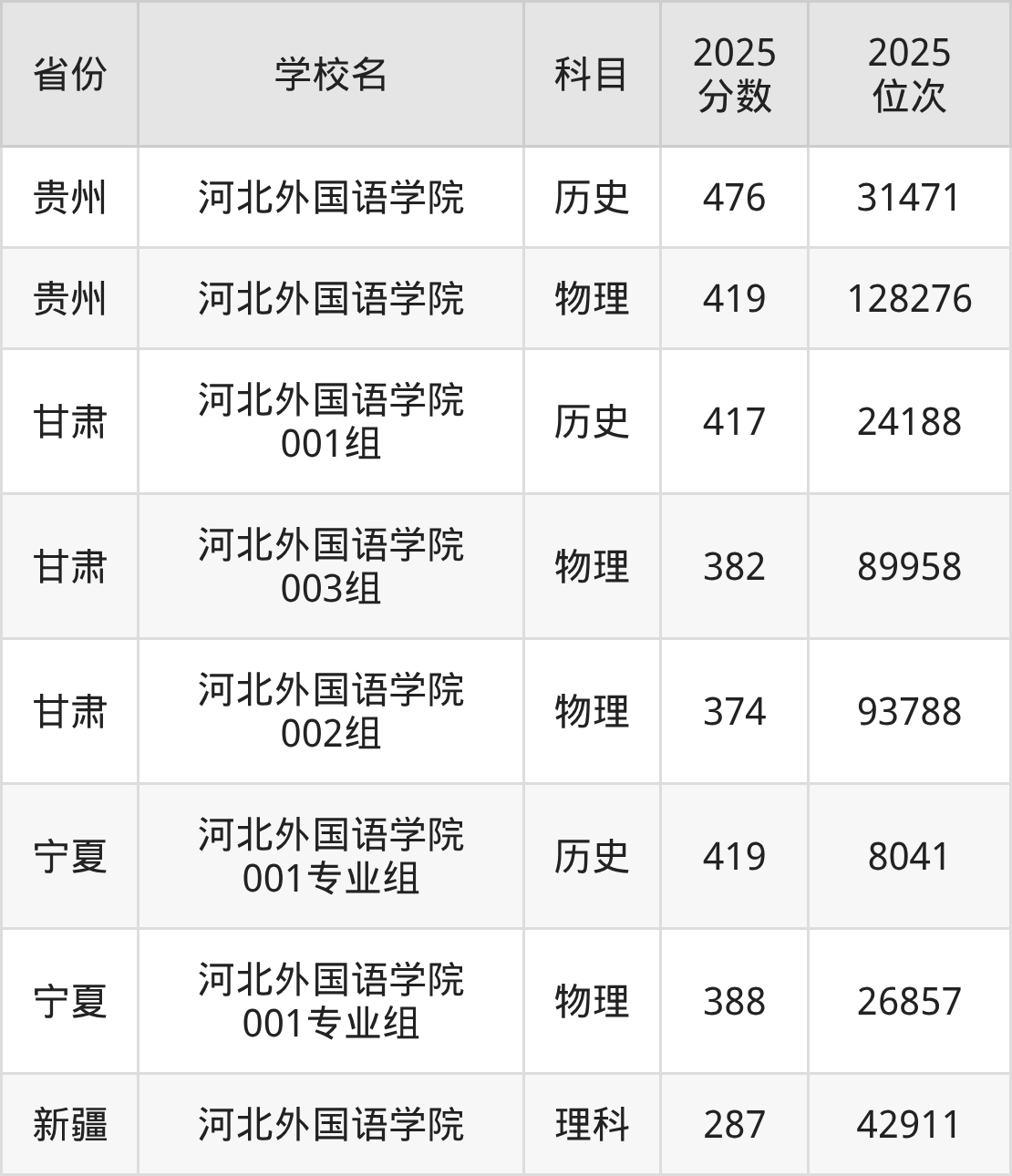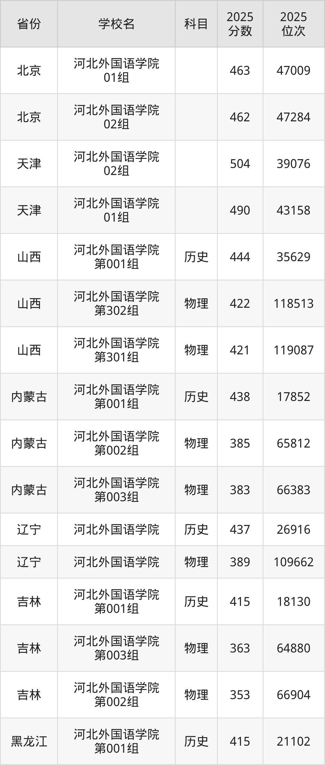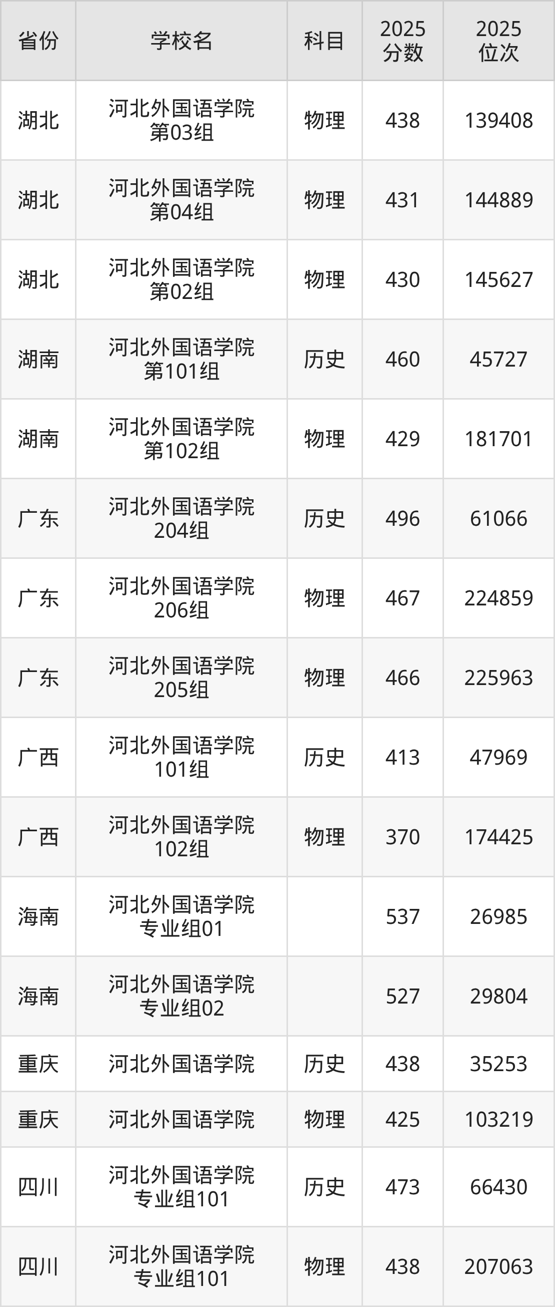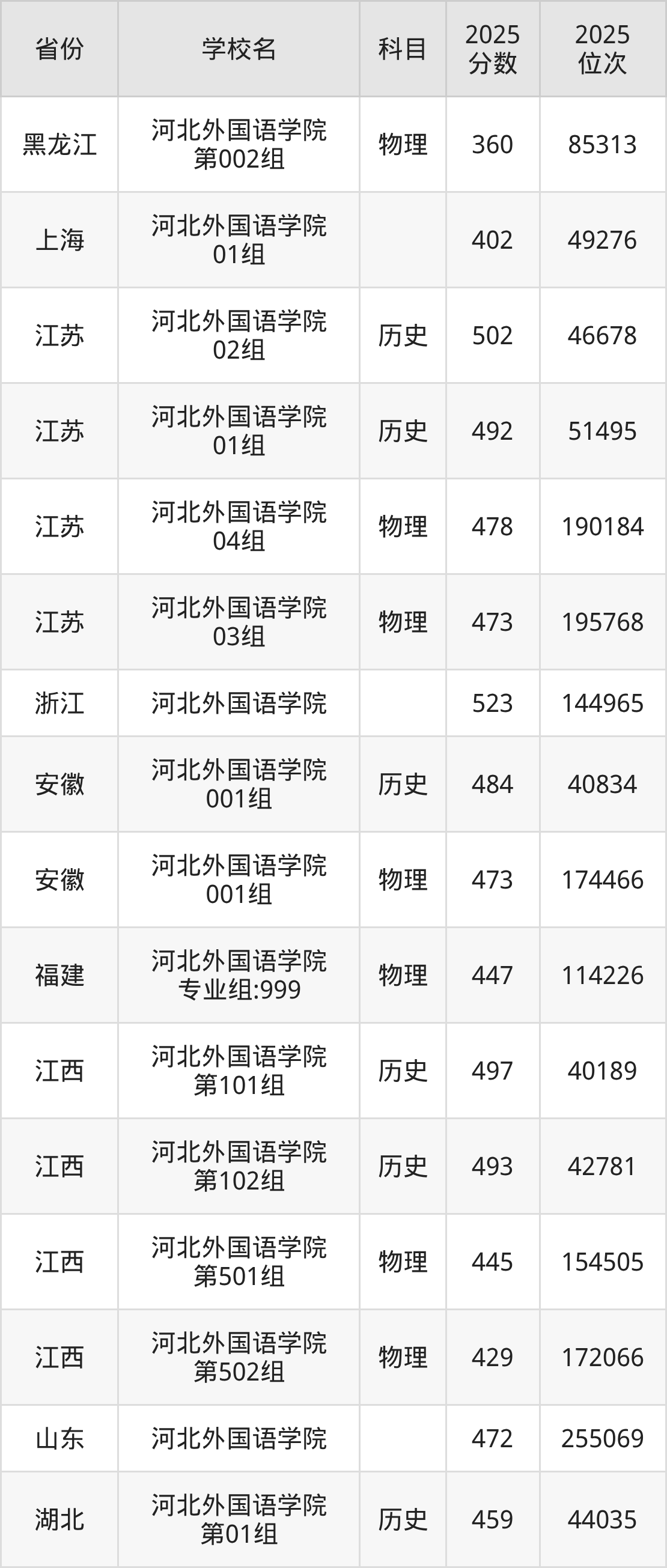 2025年河北外国语学院历史类最低分246分(221031名)、物理类最低分203分(361317名)。
