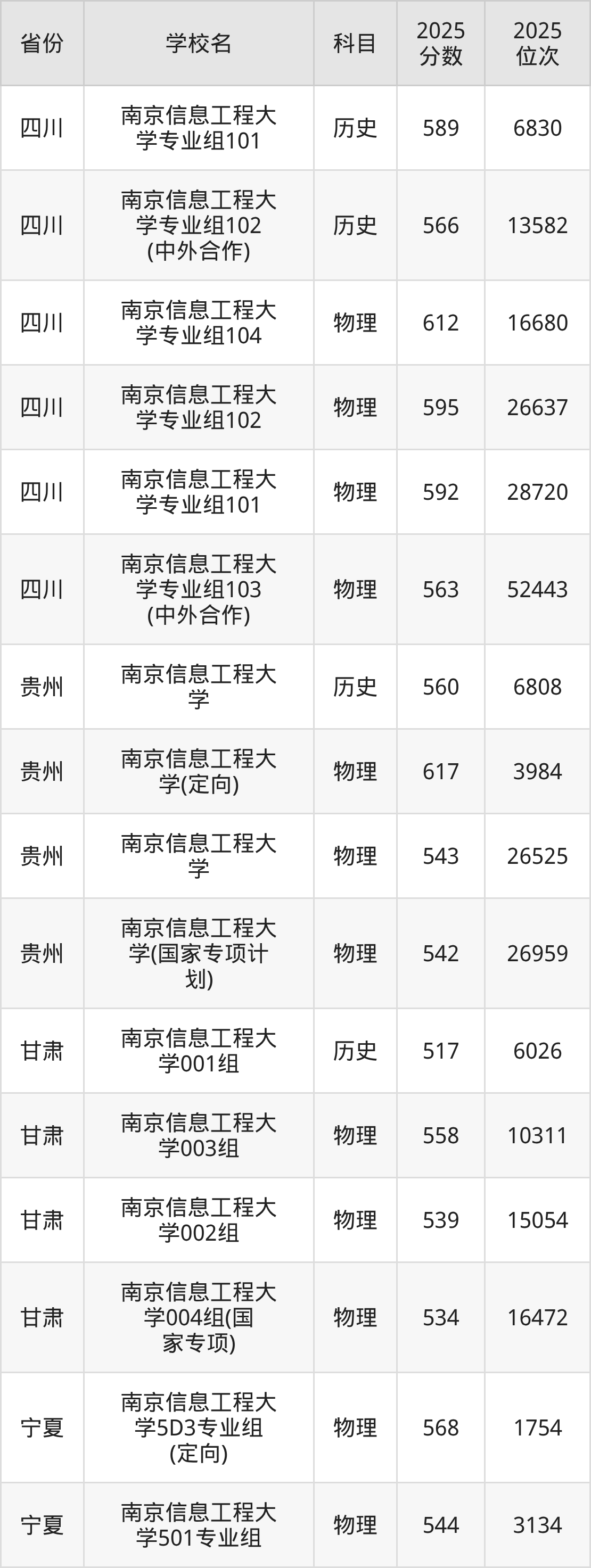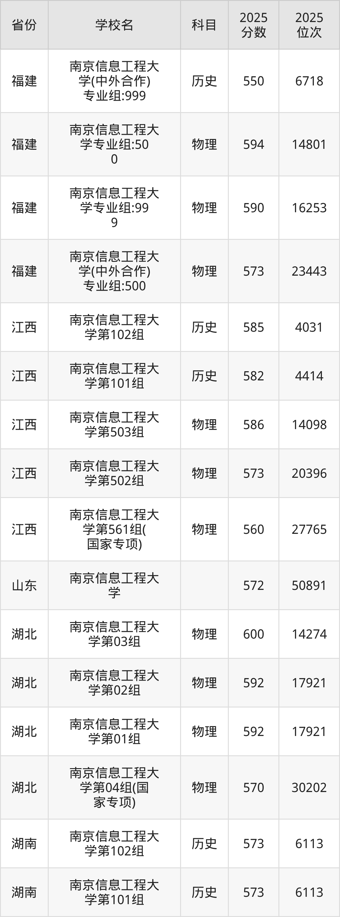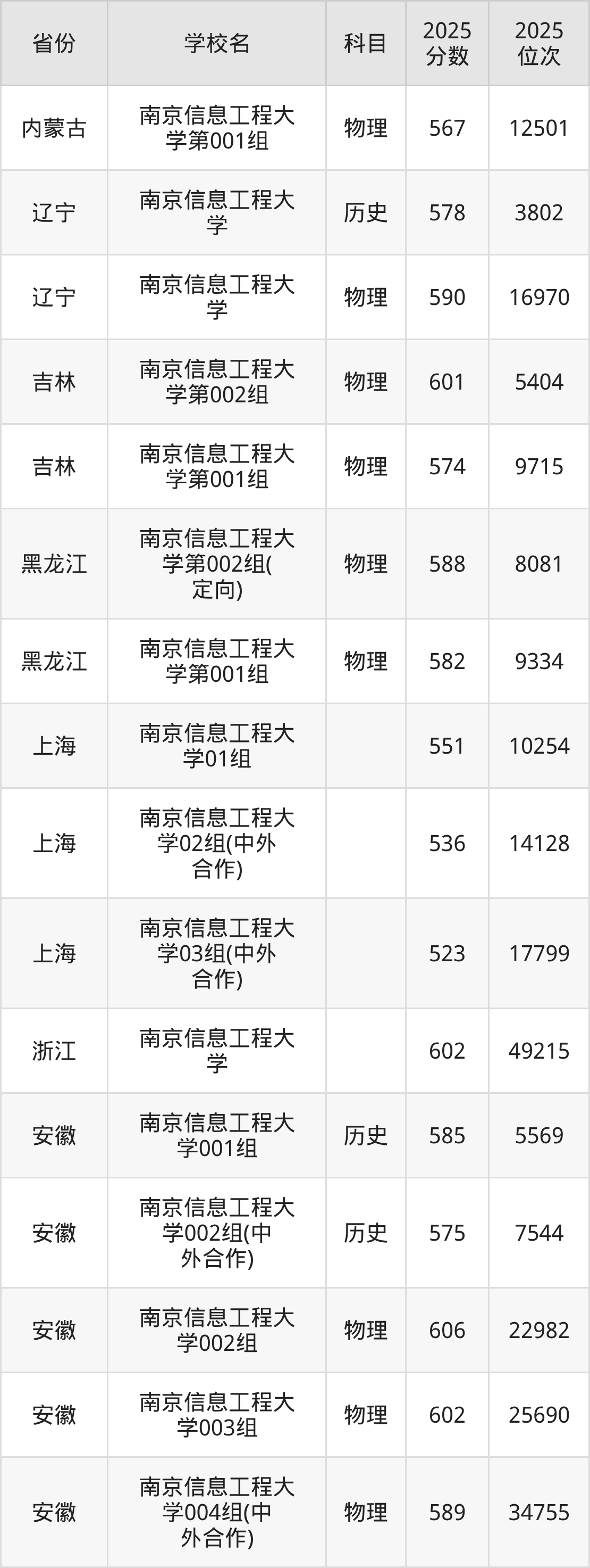 | 南京信息工程大 学03组(中外 合作) | 历史 | 569 | 15613 |
