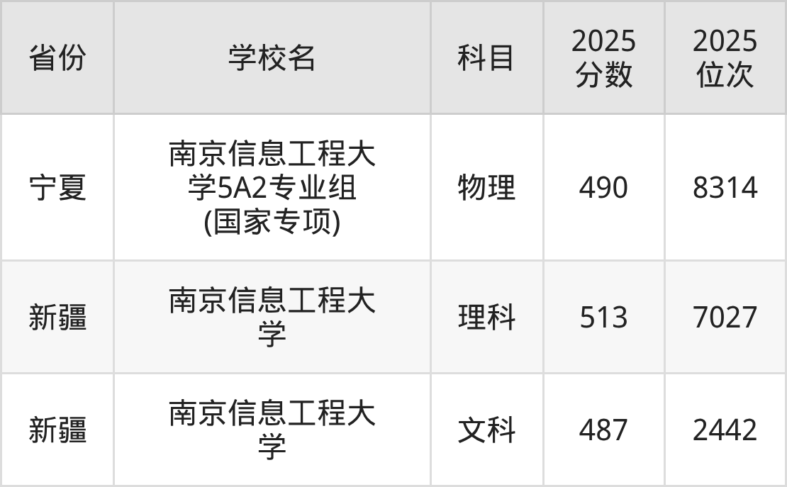 2025年南京信息工程大学在省外录取分数线范围整体位于487分到662分之间,录取分数线最低在新疆文科、录取分数线最高在海南(专业组01)。