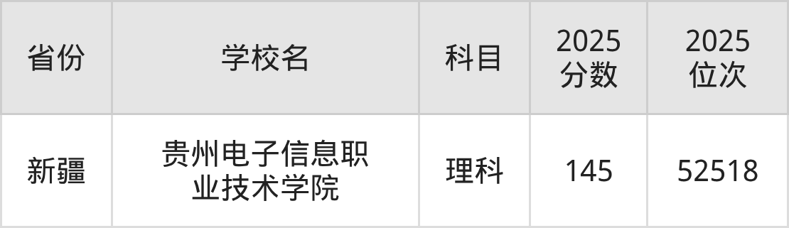 2026年贵州电子信息职业技术学院录取分数线预计在300分及以上,在各省录取最低分存在一定差异,如:2025年贵州电子信息职业技术学院在宁夏录取最低历史类328分、物理类303分,在新疆录取最低理科145分,在安徽录取最低历史类271分、物理类342分。