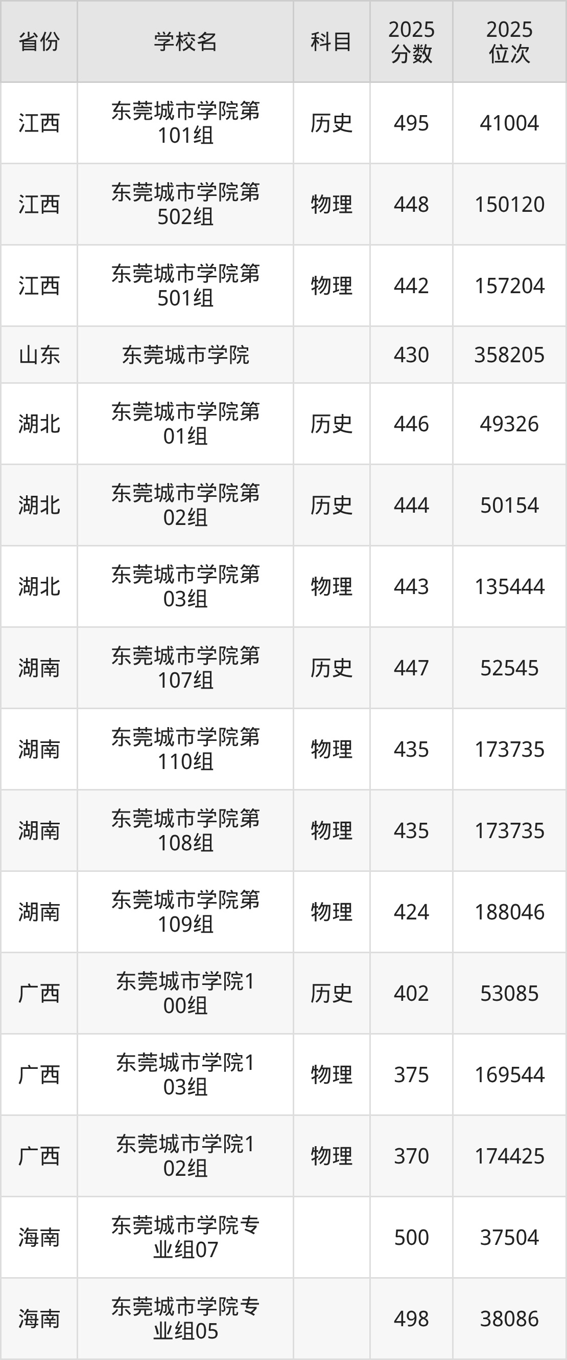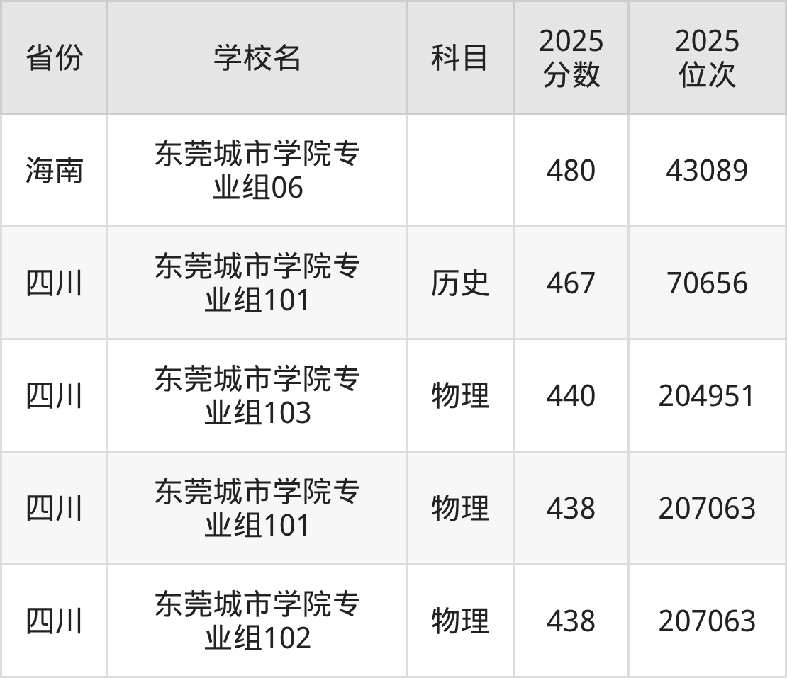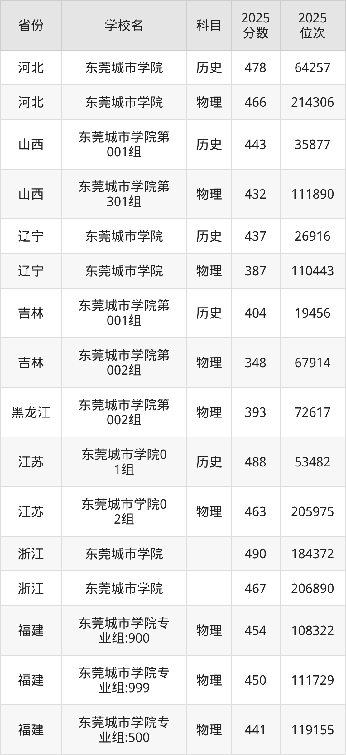 2025年东莞城市学院历史类最低分464分(91654名)、物理类最低分436分(275663名)。