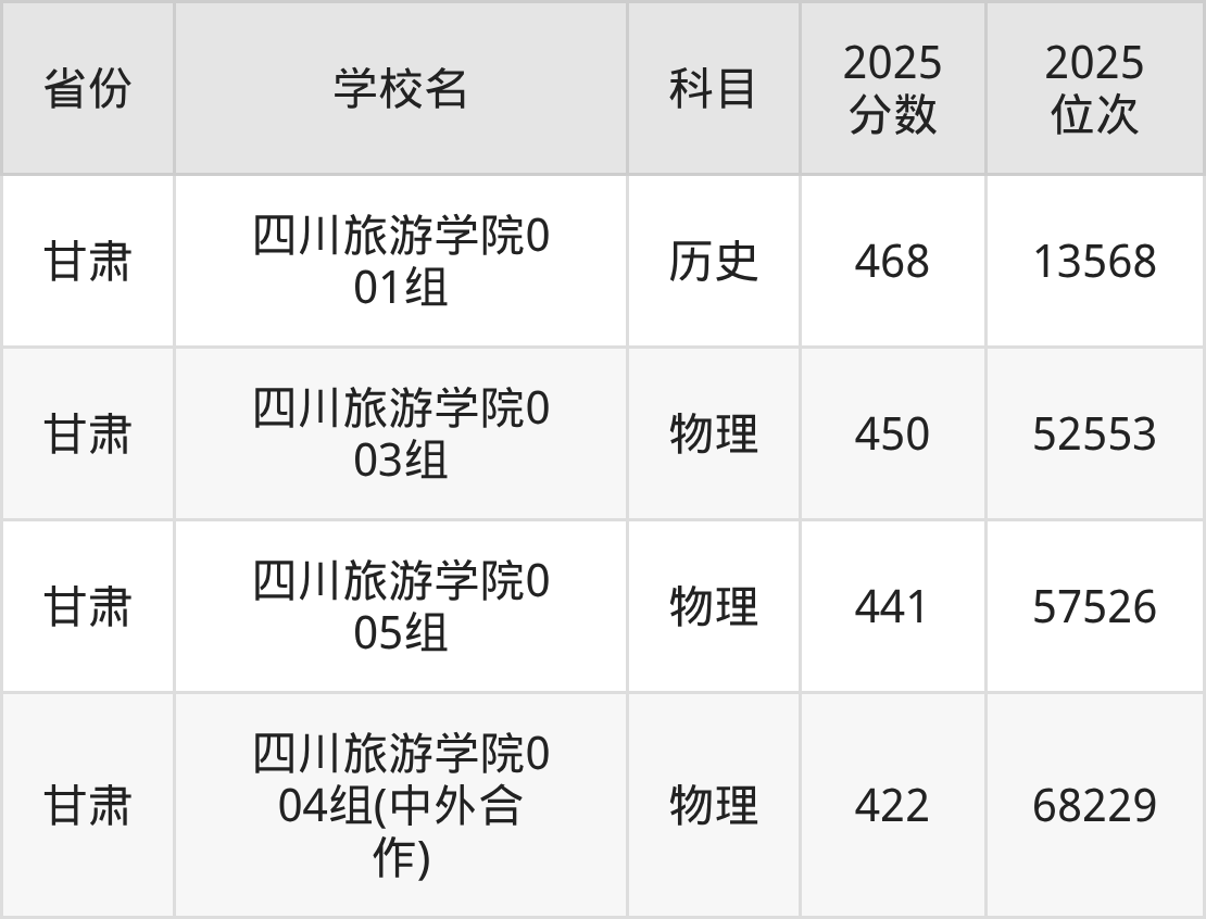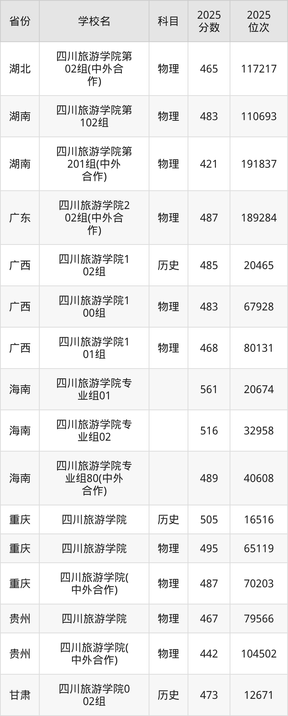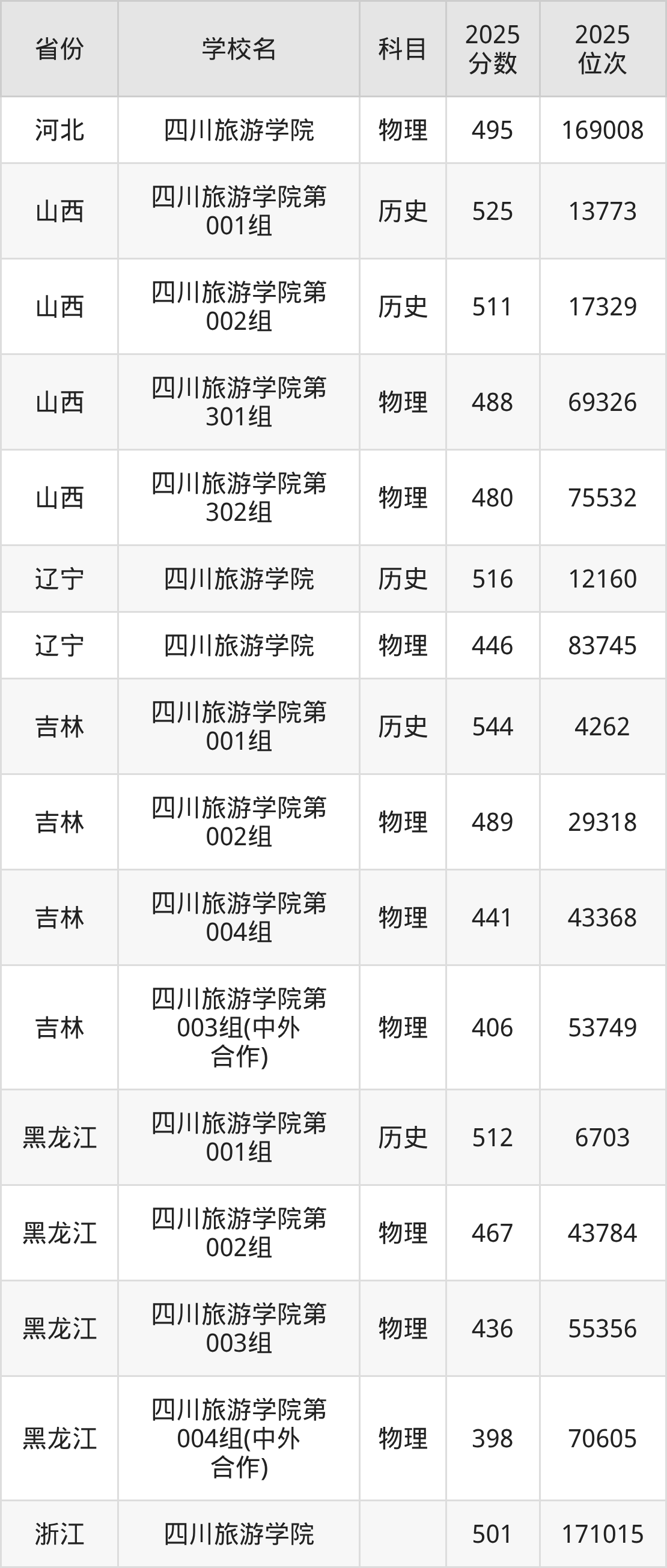 2025年四川旅游学院在省内分历史物理科目类录取,其中历史类最低分是505分、对应位次是44731名;物理类最低分是461分,对应位次是180008名。