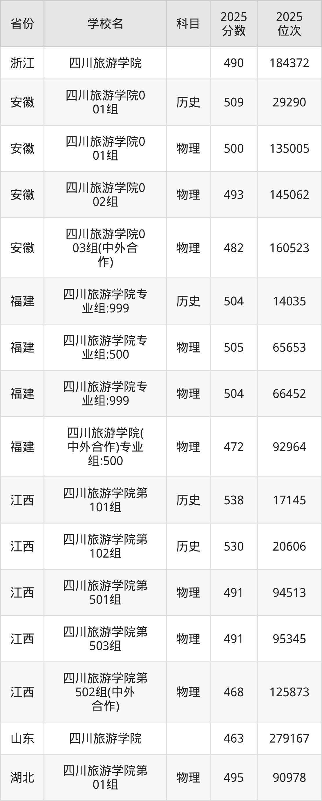2026年四川旅游学院录取分数线预计在480分及以上,在各省录取最低分存在一定差异,如:2025年四川旅游学院在浙江录取最低分是490分,在山东录取最低分是463分,在湖北录取最低物理类465分。
